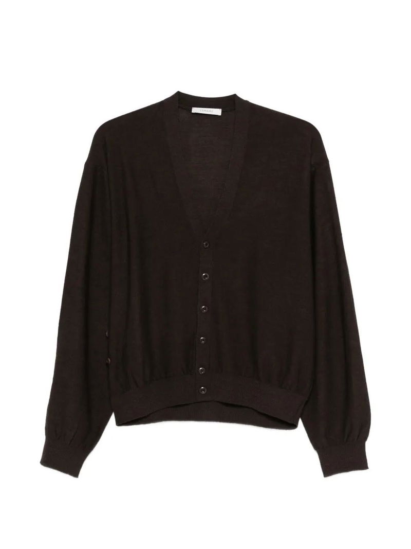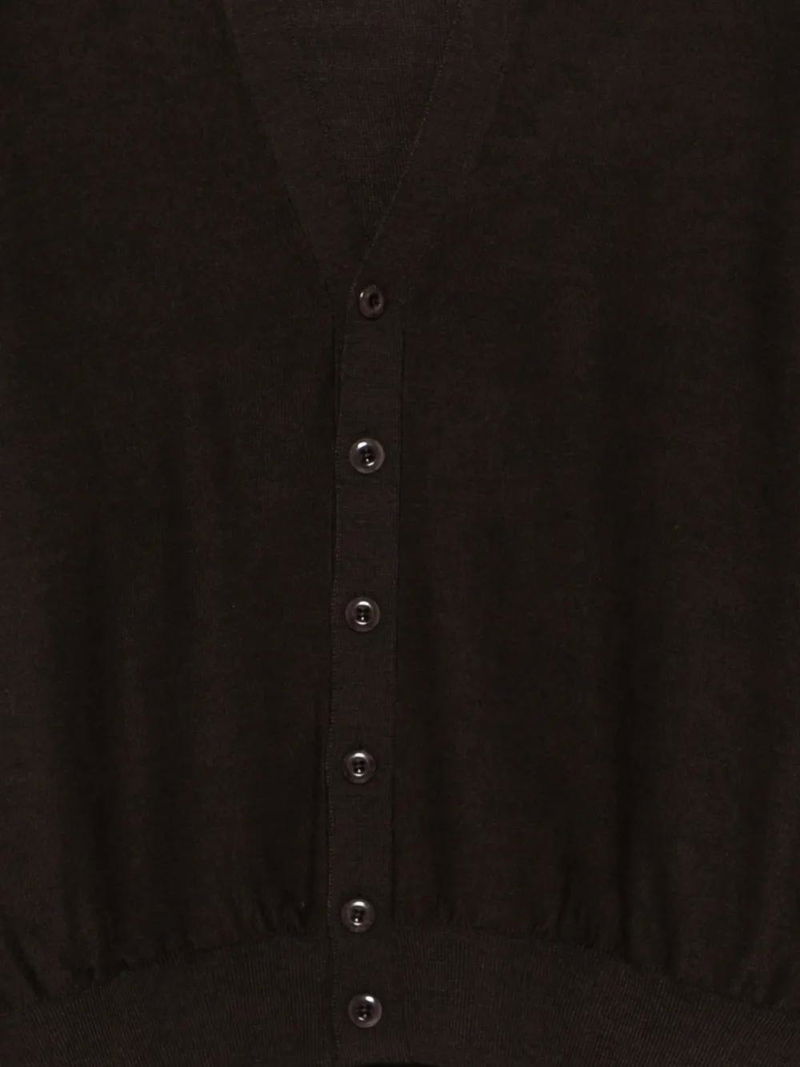 Brown V-neck button fastening long sleeves ribbed cuffs ribbed hem.