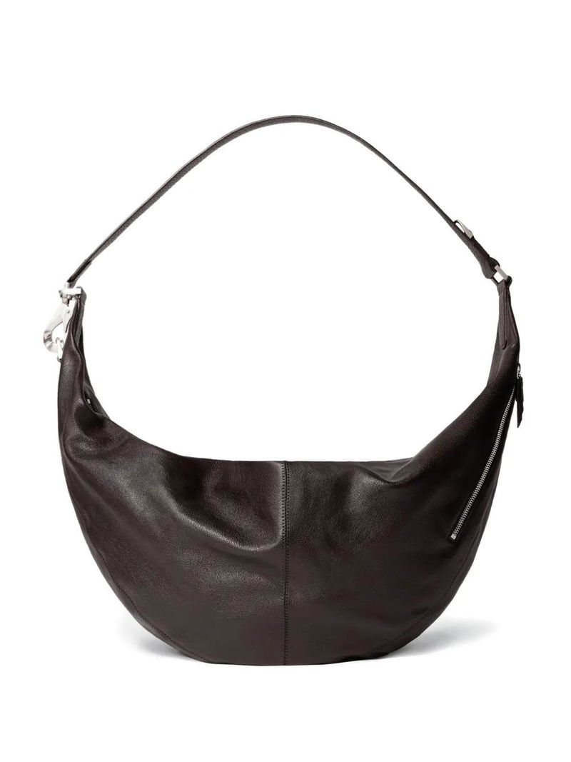 Dark chocolate, adjustable strap, zip.