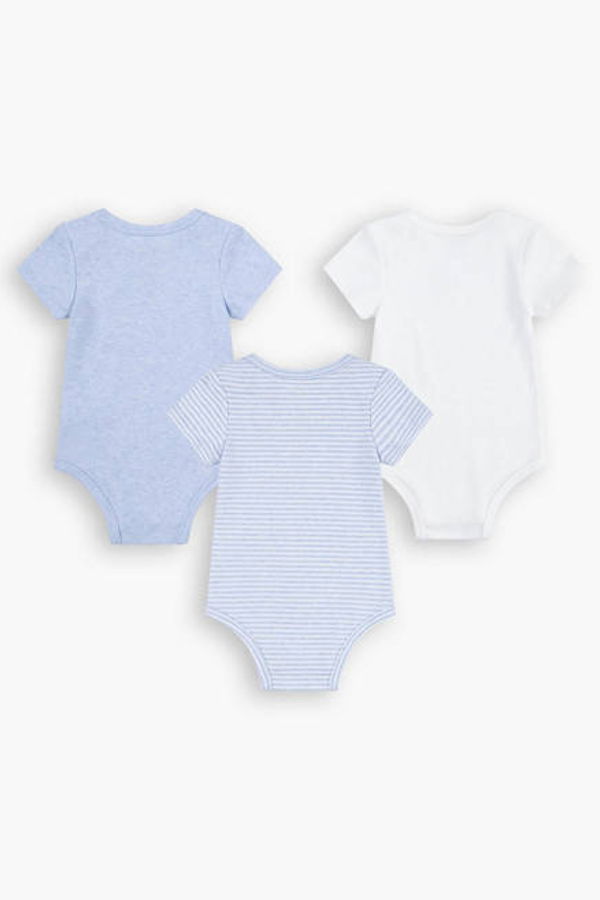 This pack features three short sleeve bodysuits Overlap shoulders and snappy tape closure for easy changing Round collar Matching colorways Made from breathable and durable organic Cotton.