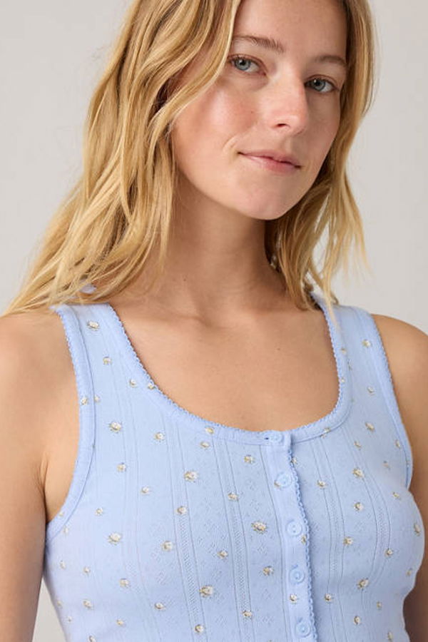 Meet the Dry Goods Pointelle Tank: stamped with the signature Dry Goods label and featuring buttons and a fitted silhouette, it won't be long before you're pairing this top with all of your denim.