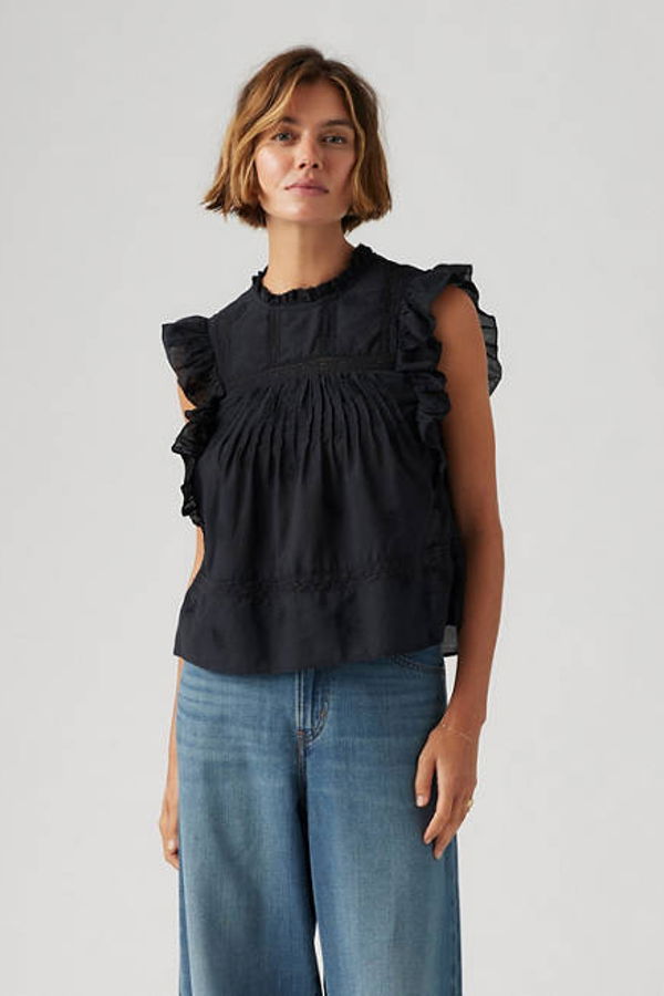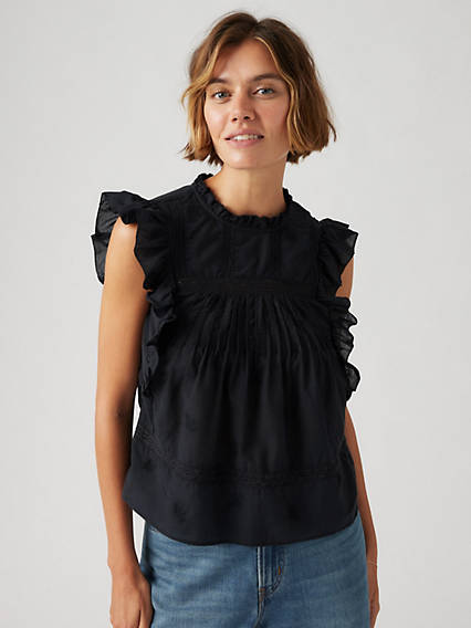 Romantic, elegant and ready to balance out your baggiest pants. Our Edith Blouse features a high neckline, flutter sleeves, a flowy fit and floral detailing.