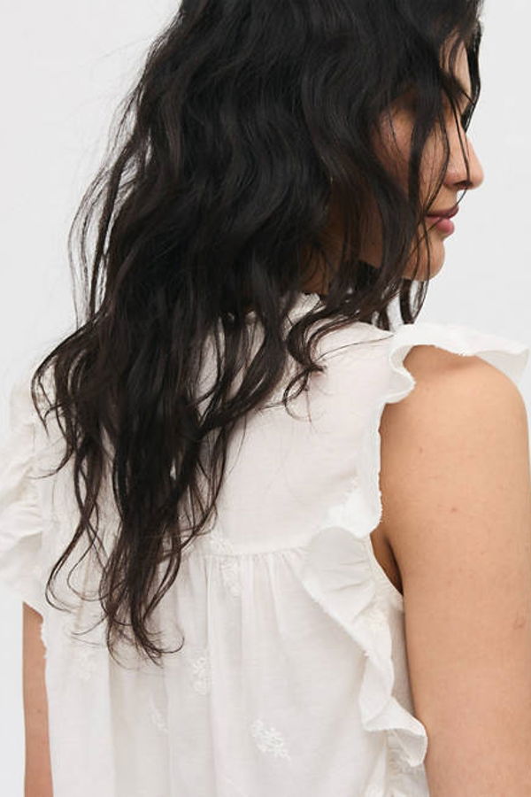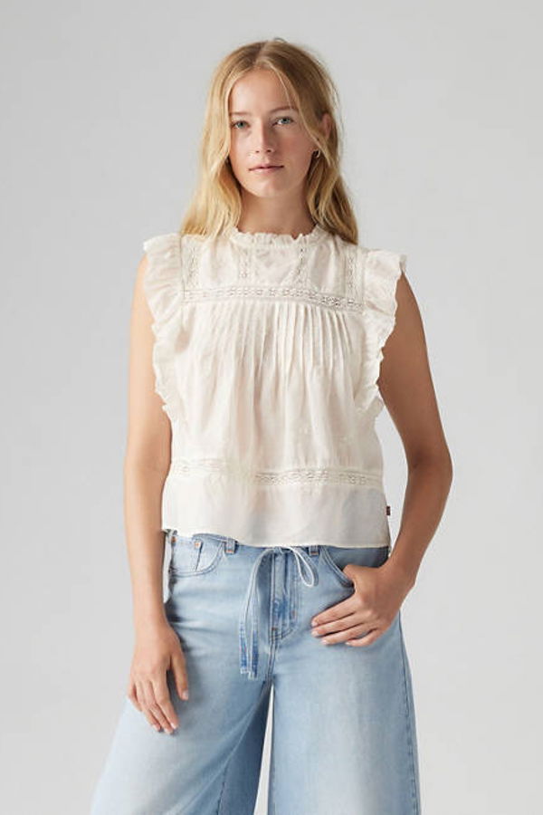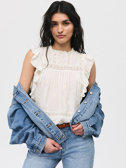 Romantic, elegant and ready to balance out your baggiest pants. Our Edith Blouse features a high neckline, flutter sleeves, a flowy fit and floral detailing.