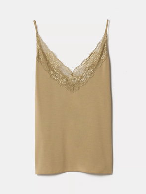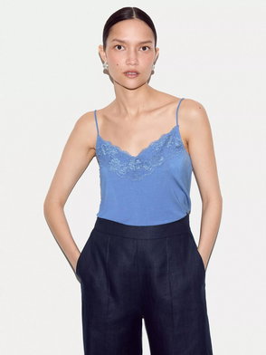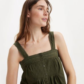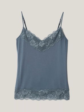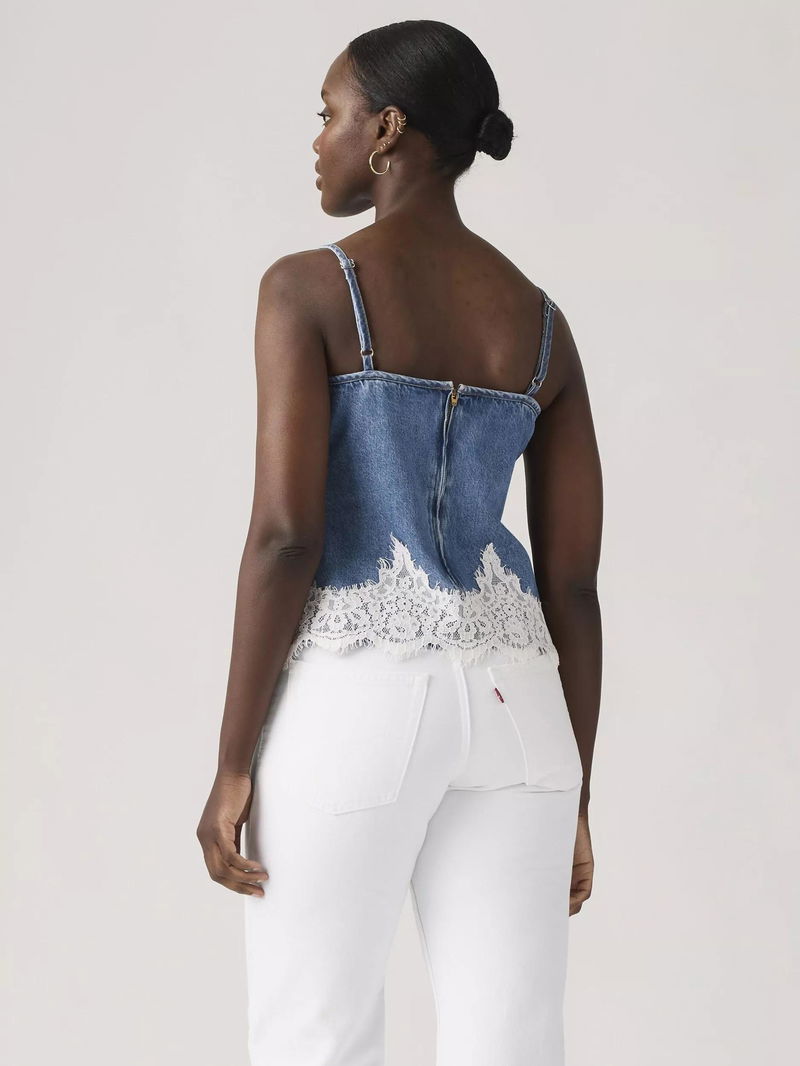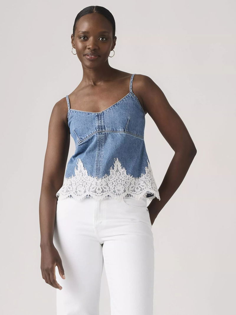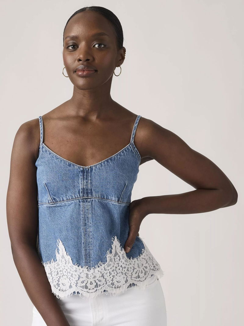 A denim cotton cami by Levi's. Featuring a V-neck and spaghetti straps, it's hemmed with lace.