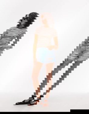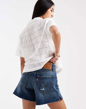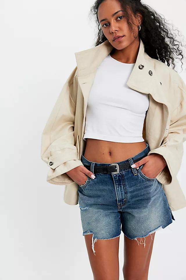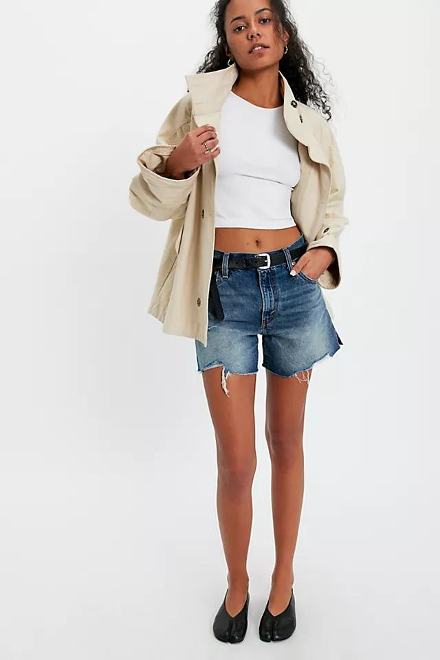 A classic high-rise denim style from Levi’s, complete with a distressed hem for a laidback look.