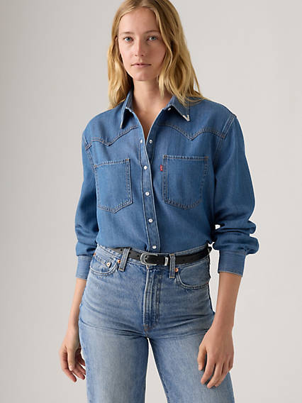 Cowboy boots not included. Our Teodora Western Shirt is a feminine take on a western staple, with a tipped collar, a classic snap-button front, two patch pockets, a relaxed fit and a western-inspired yoke design.