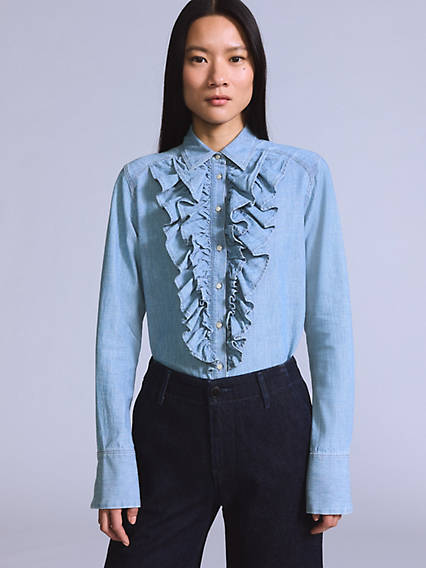 Levi's® Blue Tab™ is an elevated collection that infuses our iconic denim heritage with traditional craftsmanship. Expect thoughtful details, sharp tailoring and finishes that are rich with character. This is an entirely new shape of Blue. We reimagined the formal dress shirt to create our polished Tuxedo Shirt. Cut with a classic fit, this button-up top features a double ruffle design and extra long cuffs that you can wear out or tucked in.