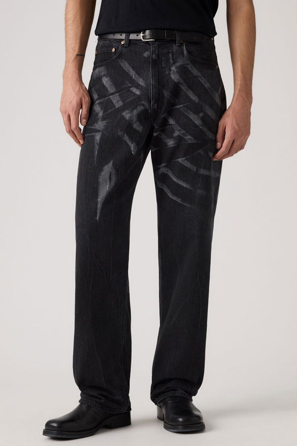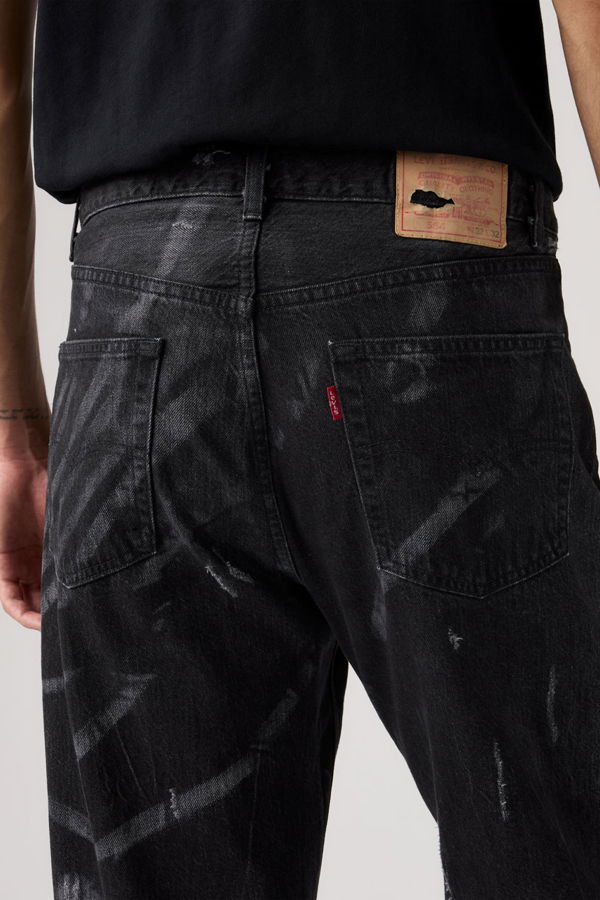 This is a stitch-for-stitch reproduction of a pair of Levi's® from the 1990s. The original jeans were found on 4th and Market Street in San Francisco and were wedged into grates on the street and driven over, leaving behind a unique pattern.