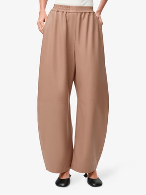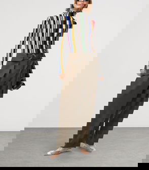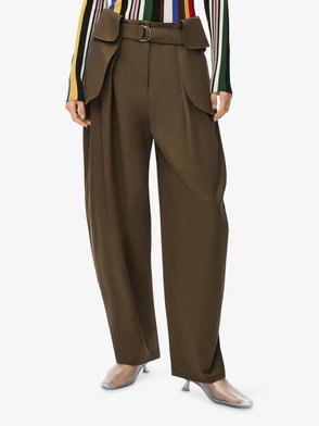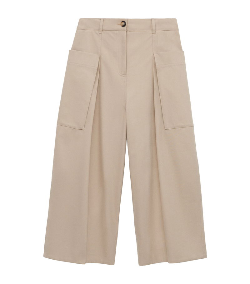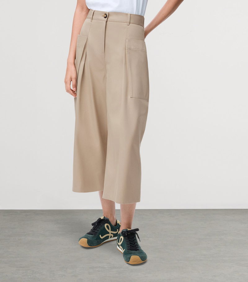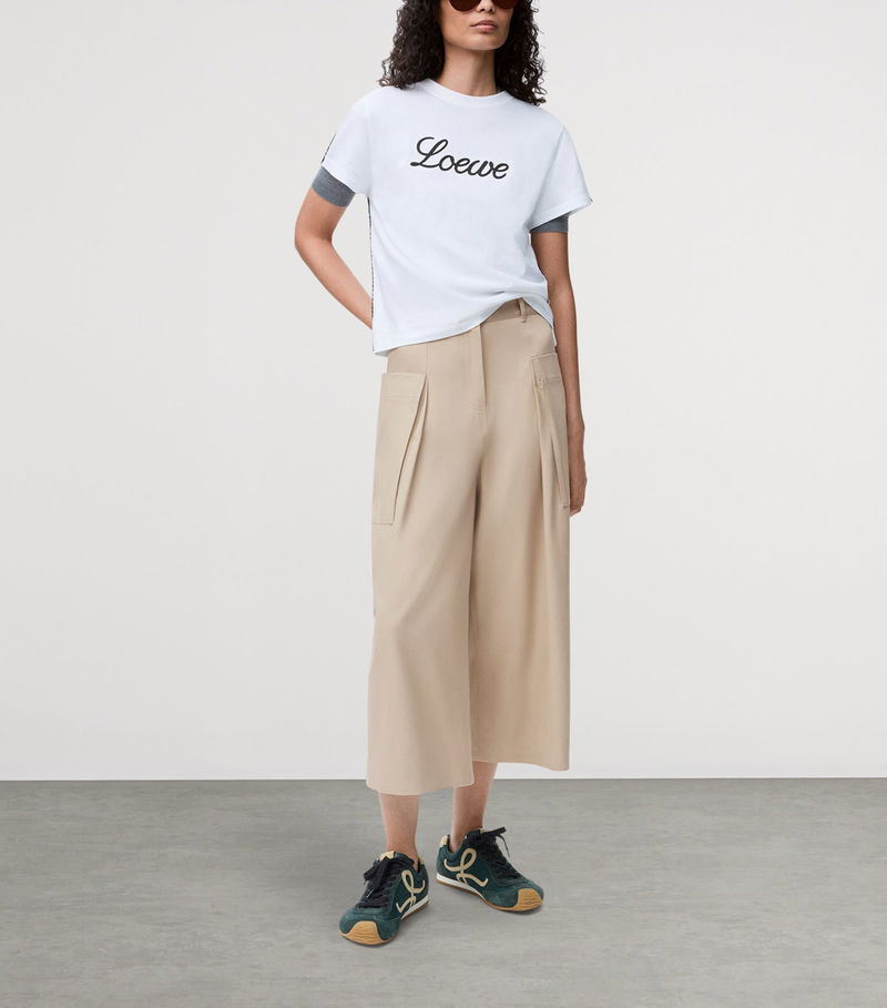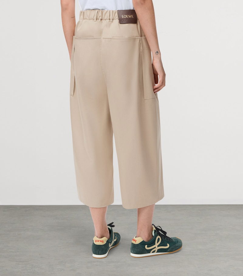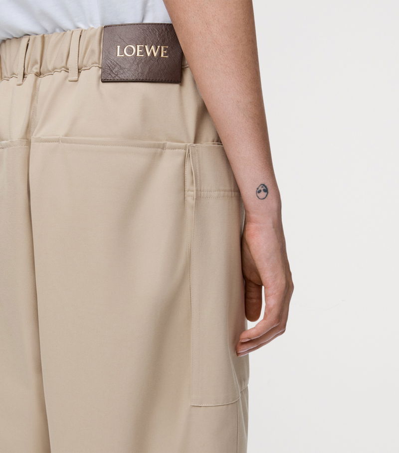 Reflecting the unconventional, sculptural silhouettes of its accessories, loewe's clothing features a suite of utterly unique silhouettes and details. Take these trousers as an example – leaning into a distinct '90s stylistic reference, they feature a wide-leg and statement-making cropped leg, complementing the oversized patch pockets and chino-like cotton-silk gabardine.
