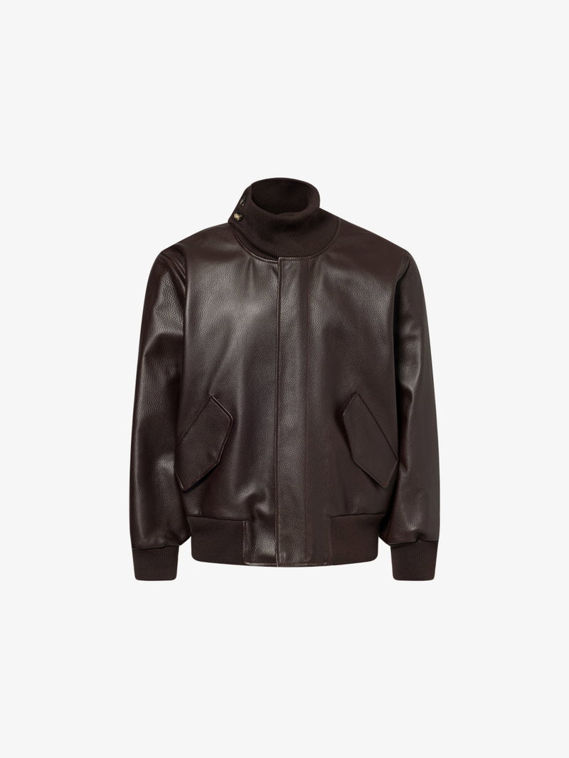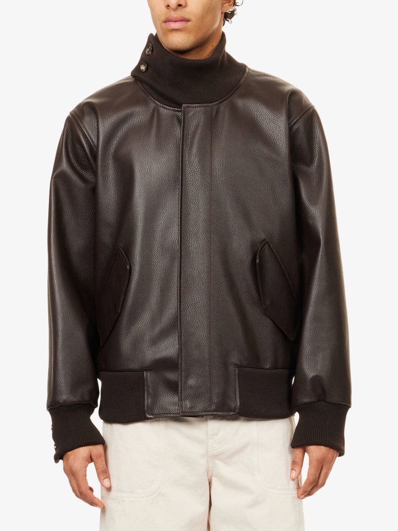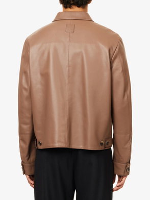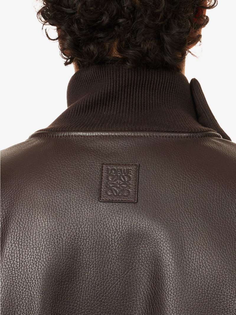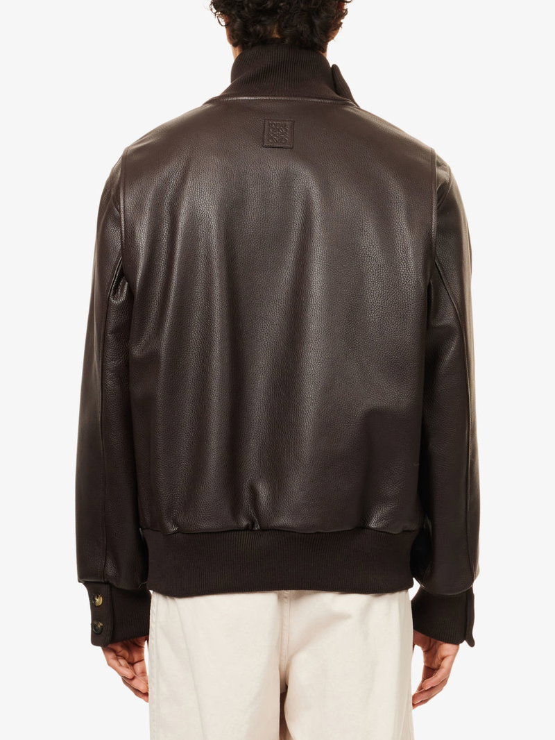 LOEWE leather jacket. Concealed snap and zip fastenings at front. Regular fit, high neck, long sleeves, flap pockets at front, logo patch at back.