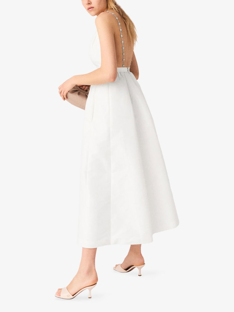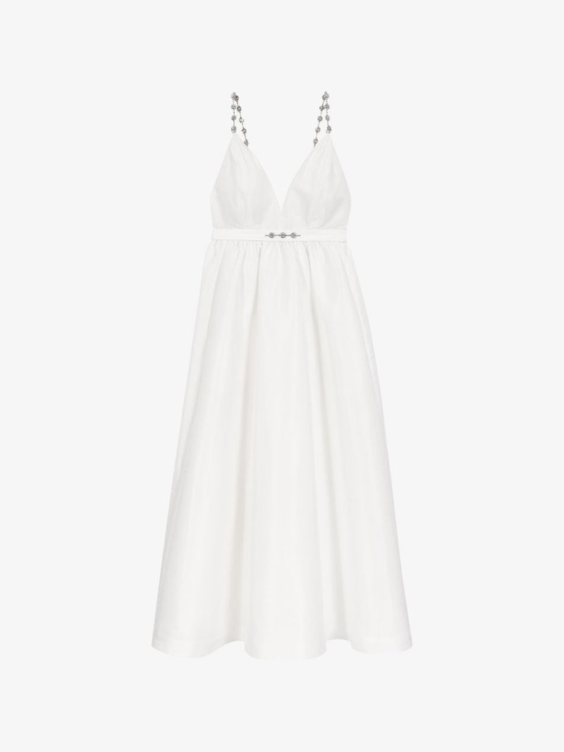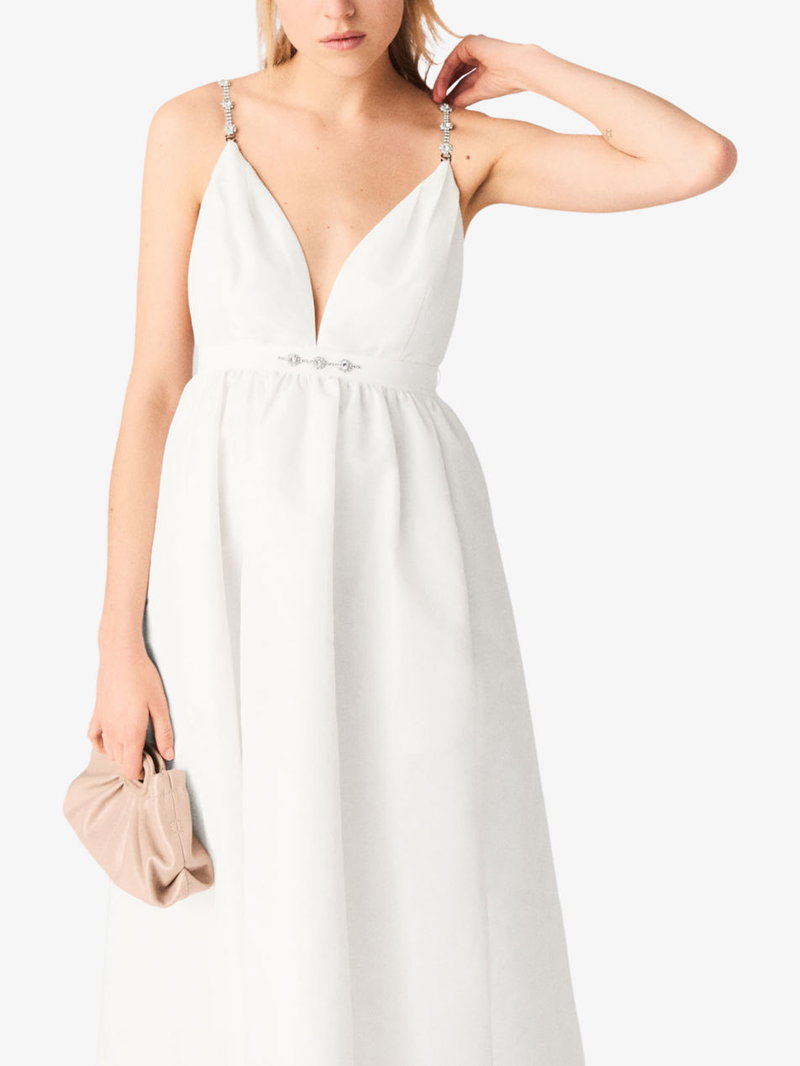 Regular fit, V-neck, jewel embellished straps, fitted waist, full skirt.