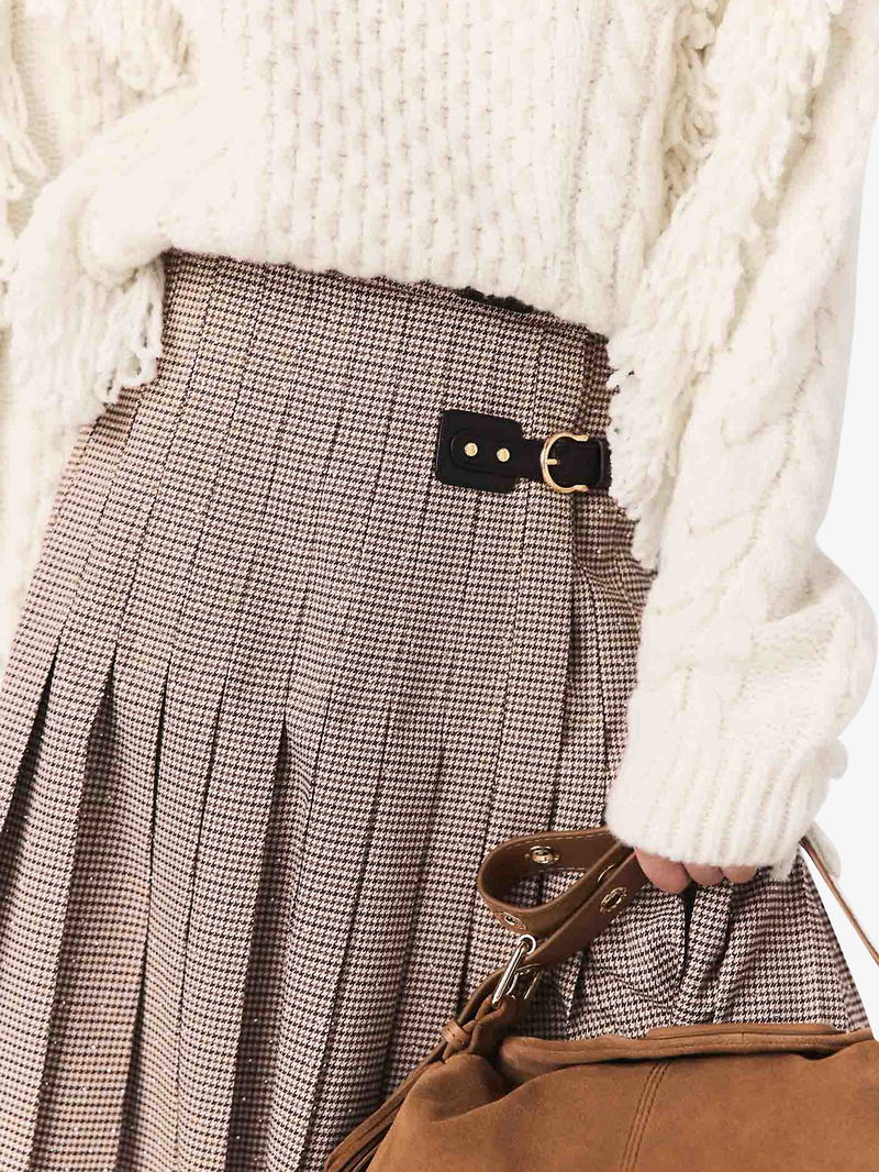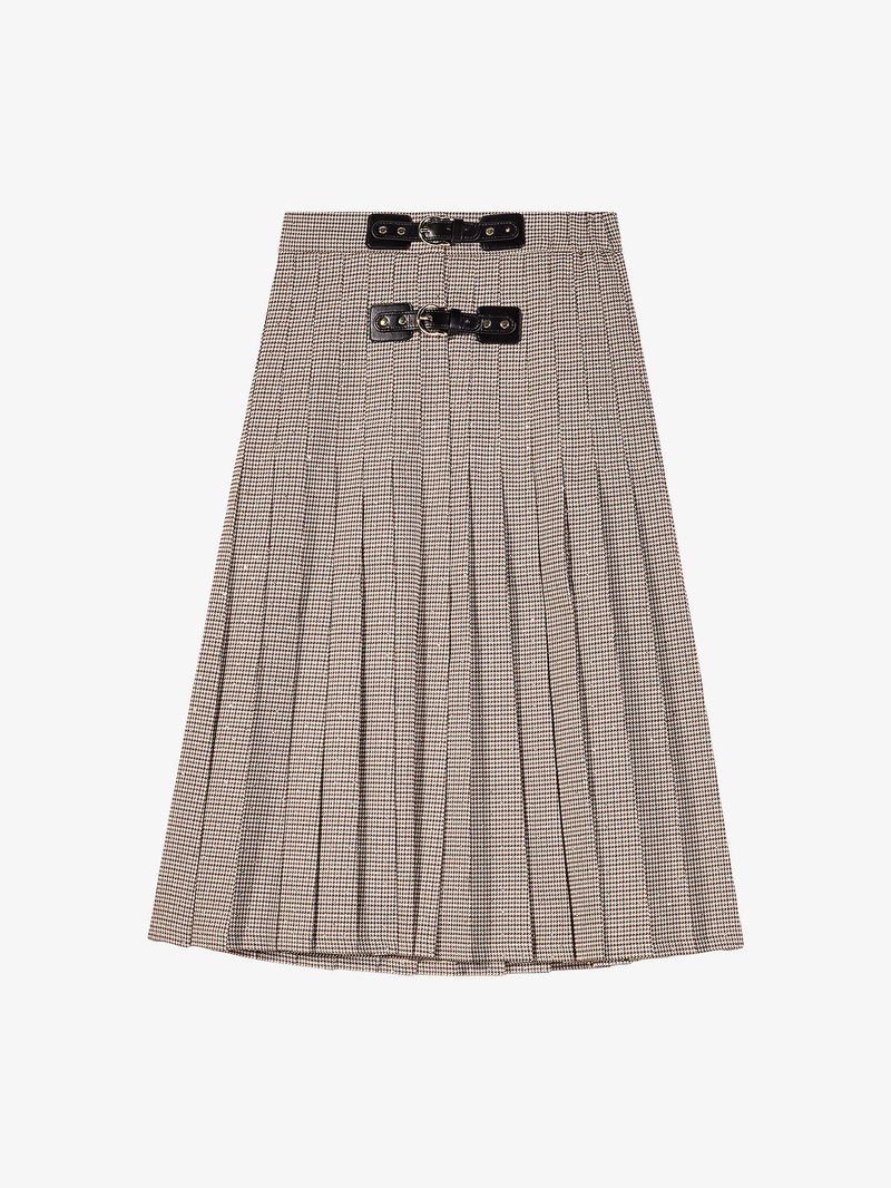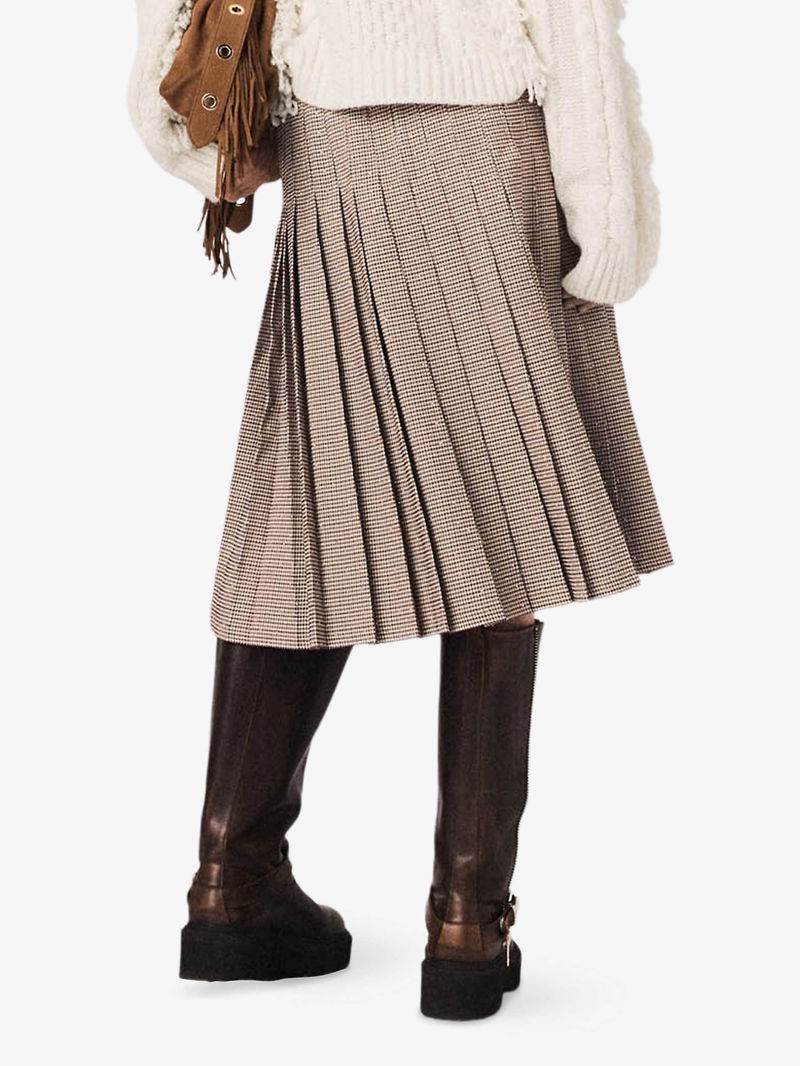 Pleated Check-Pattern Stretch-Woven Midi Skirt