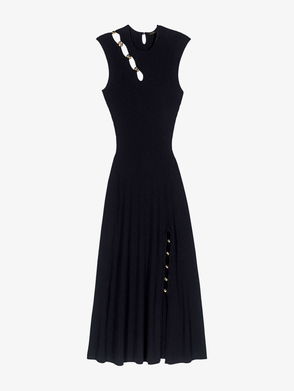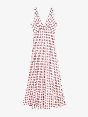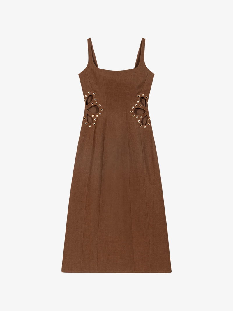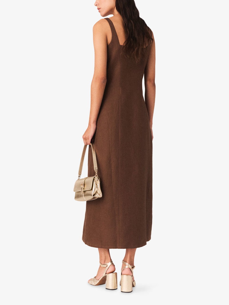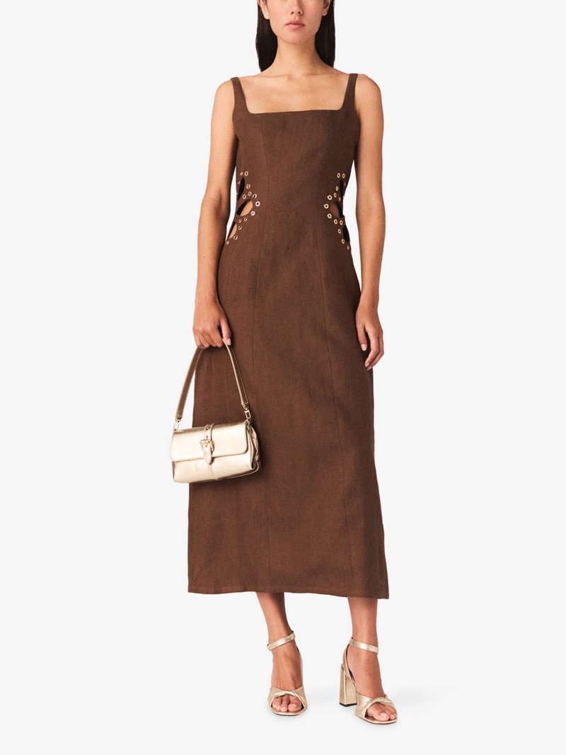 Maje linen maxi dress. Zip fastening. Regular fit, square neck, sleeveless, floral cut-outs and eyelet embellishments to waist. Lightweight, non-stretch.