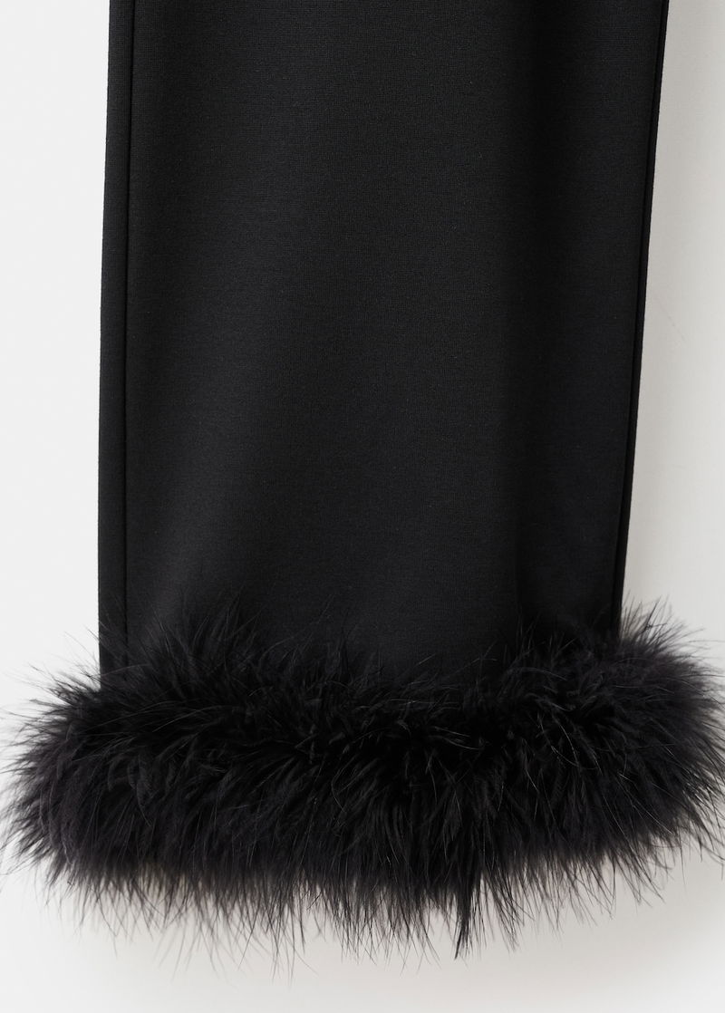 Capri design. Mid-rise. Feather trim at the hem. Side zip closure. Total look.