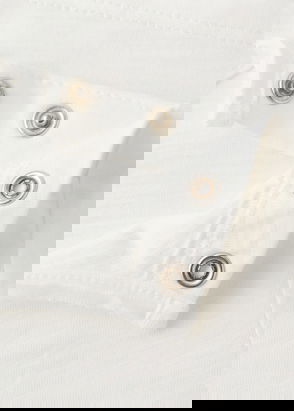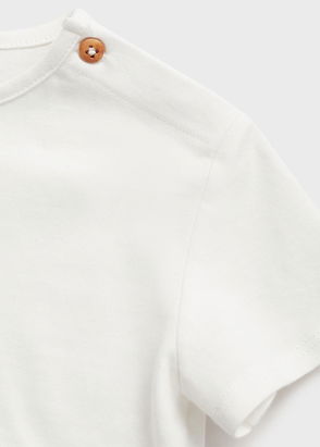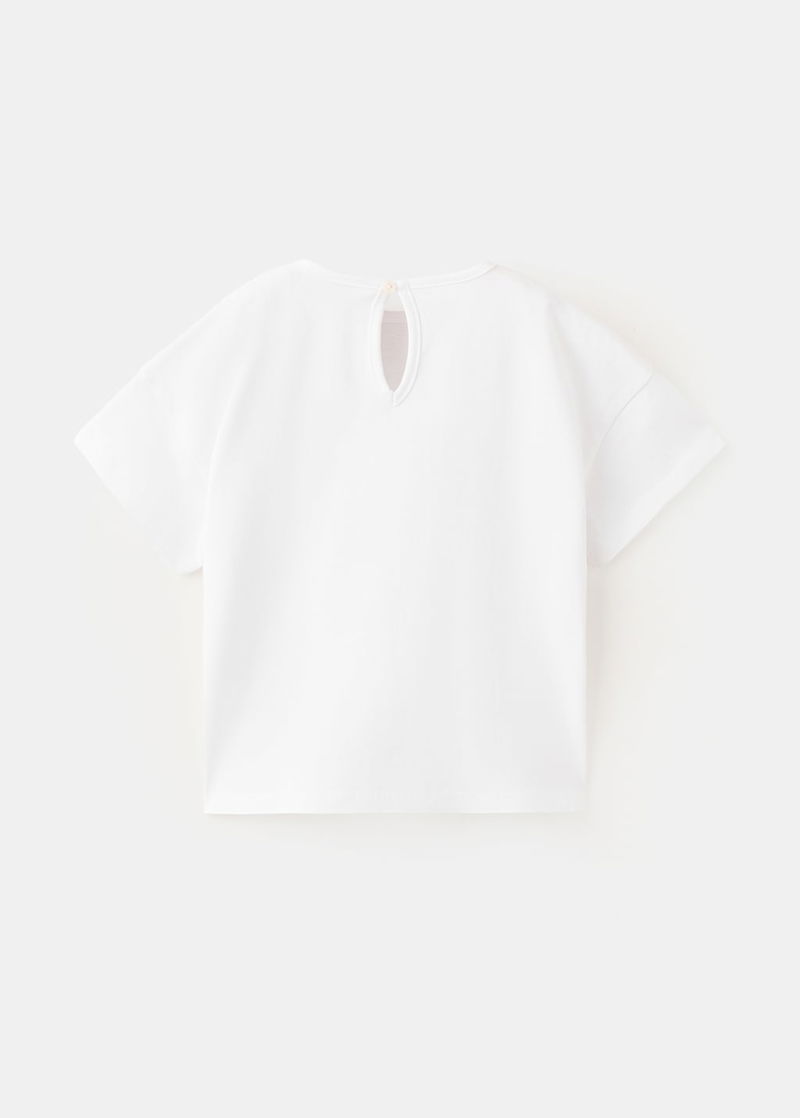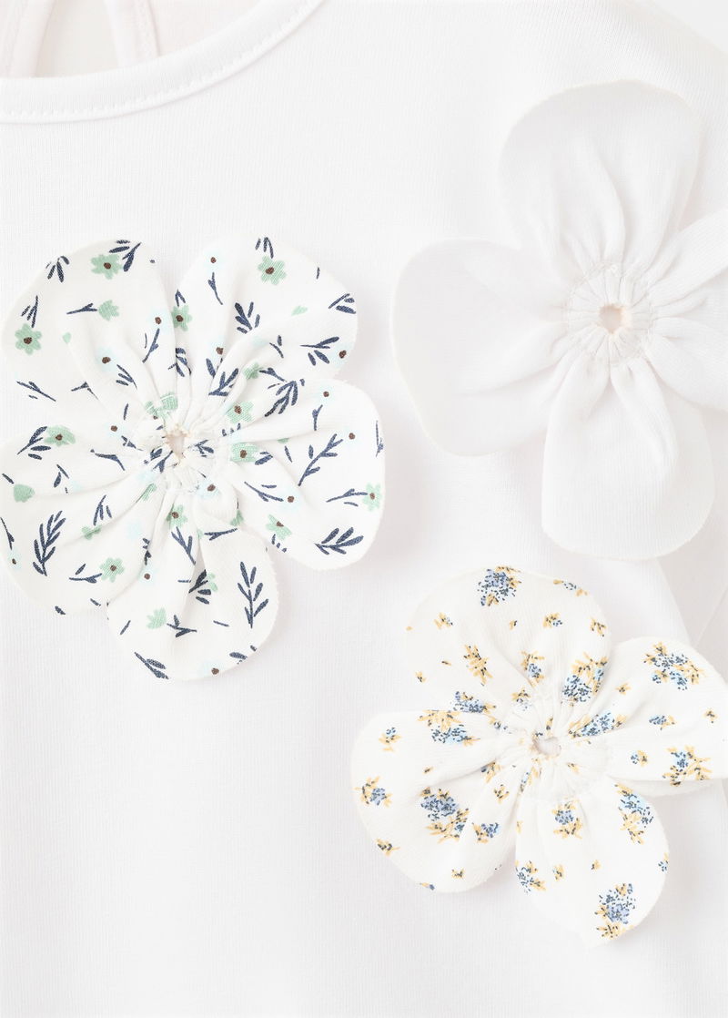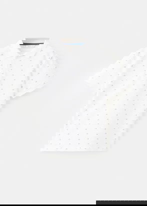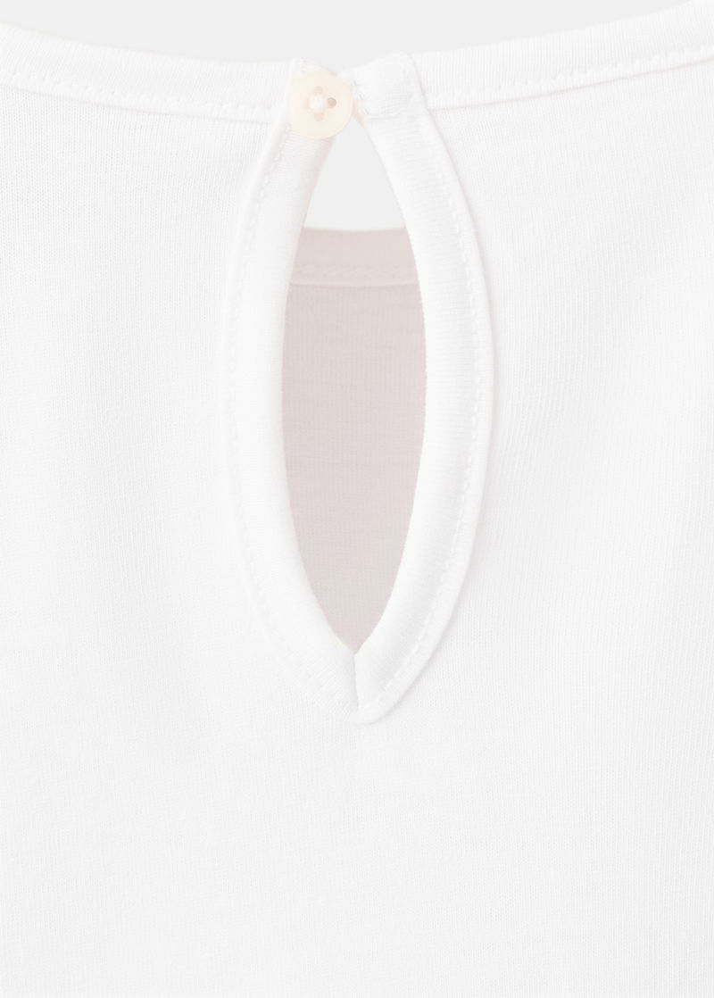 Crafted from 100% cotton fabric, this garment features a straight design with short sleeves. It stands out for its embossed floral detail and teardrop fastening at the back.