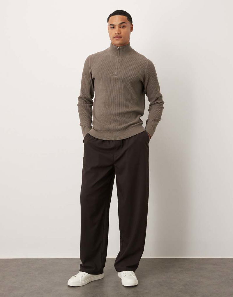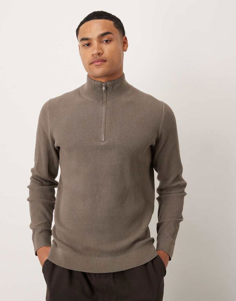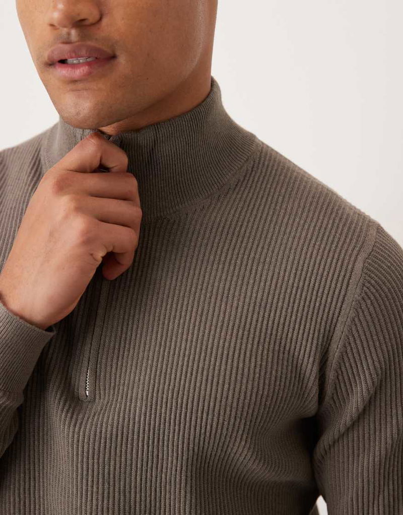 Cotton Mix Ribbed Quarter Zip In Brown