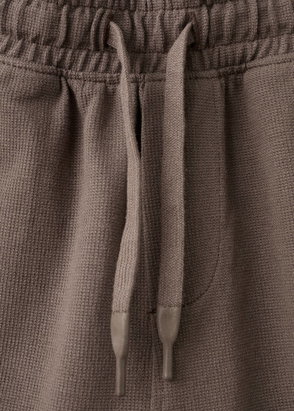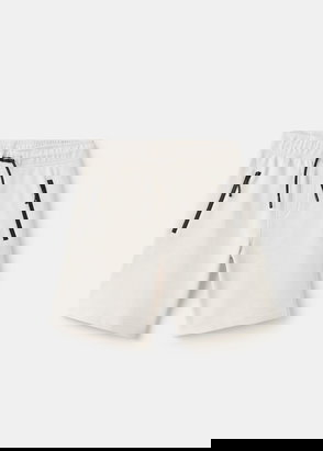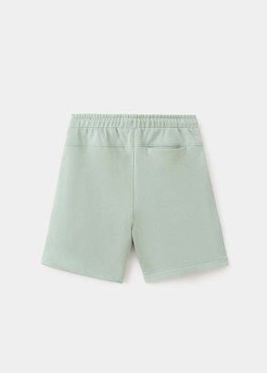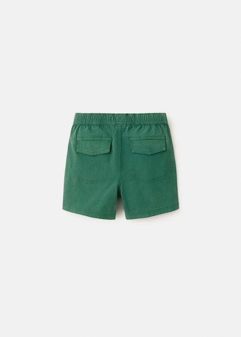 Cotton fabric. Straight design. Short design. Elastic waist with drawstring. Two side pockets. Two rear patch pockets.