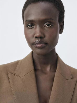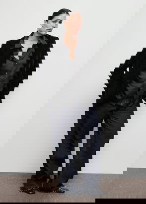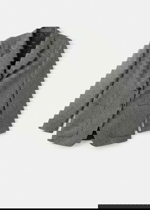 Linen and lyocell blend fabric. Suit style. Straight design. Lapel-collar V-neck collar. Long sleeve. Two pockets with flaps on the front. Button closure. Total look.
