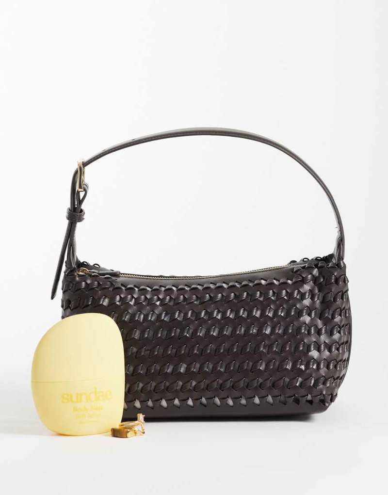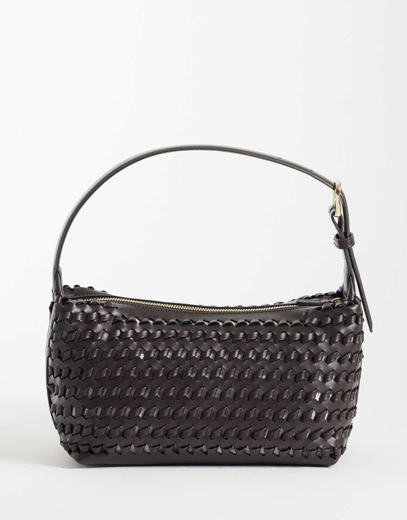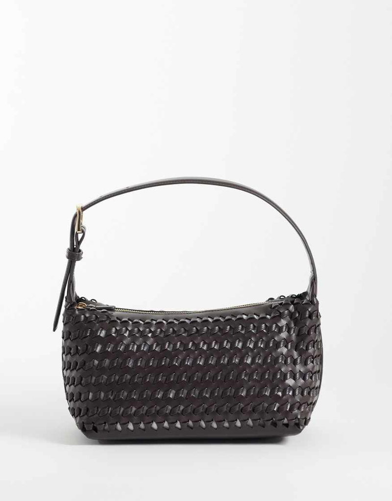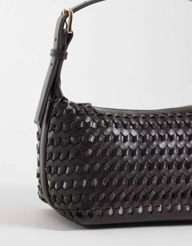 Faux Leather Woven Shoulder Bag In Dark Brown