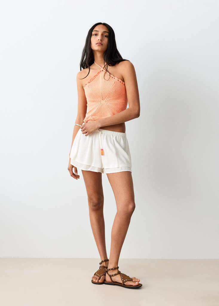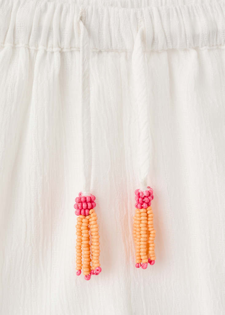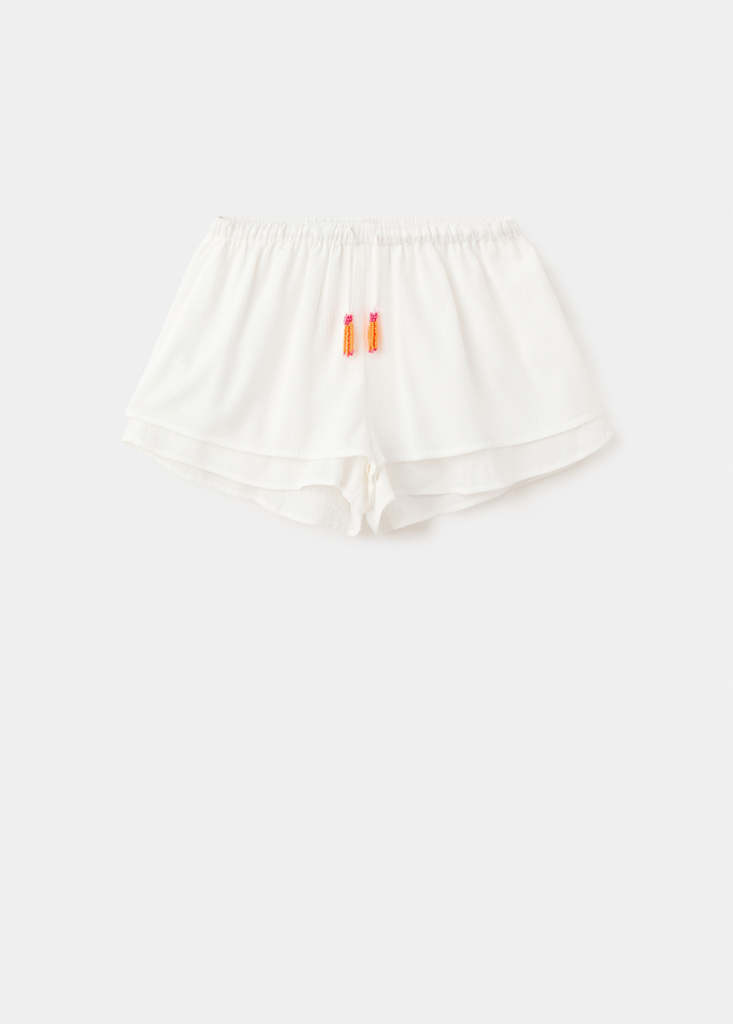 Fluid fabric. Straight design. Short design. Elastic waist with adjustable drawstring. Beaded detail.