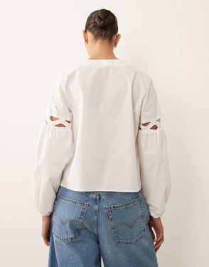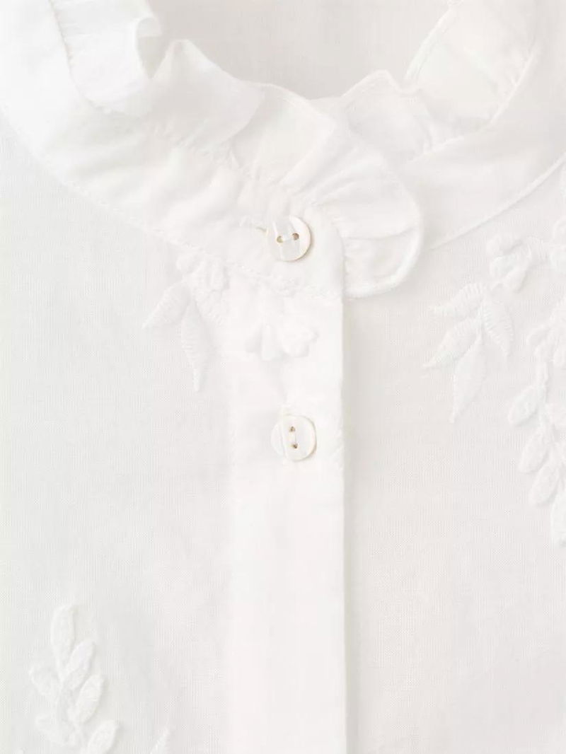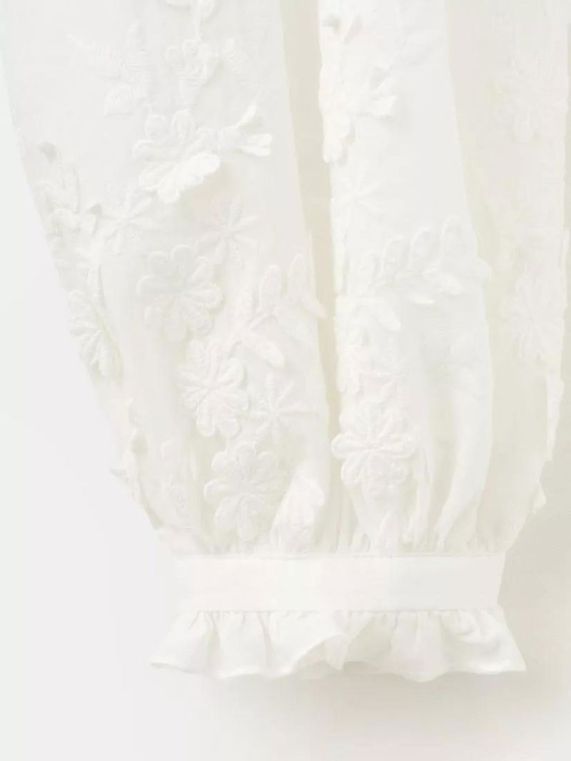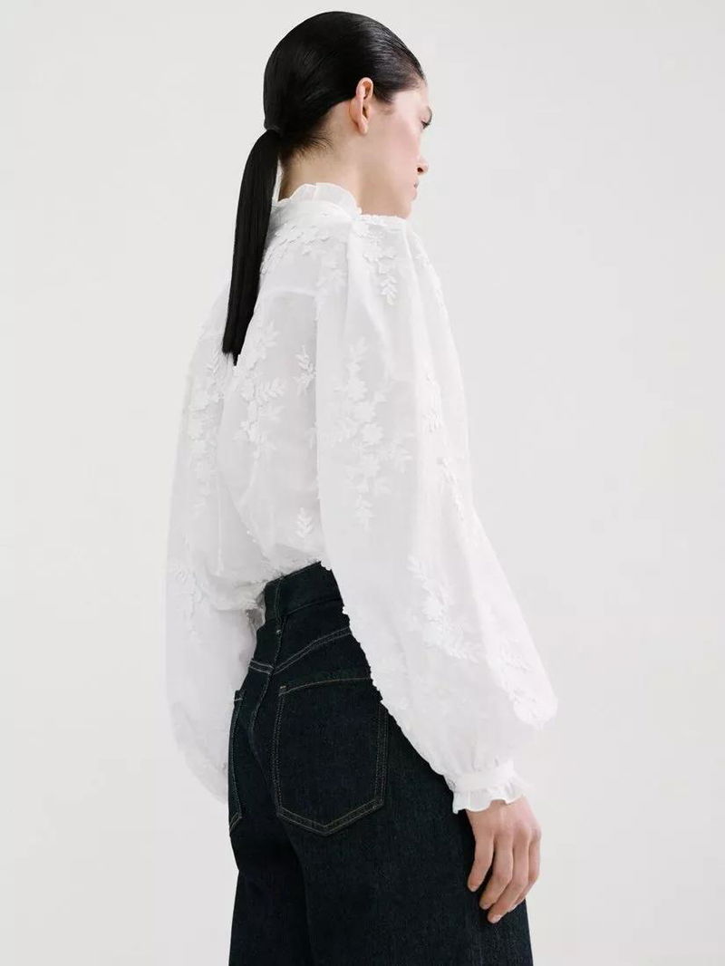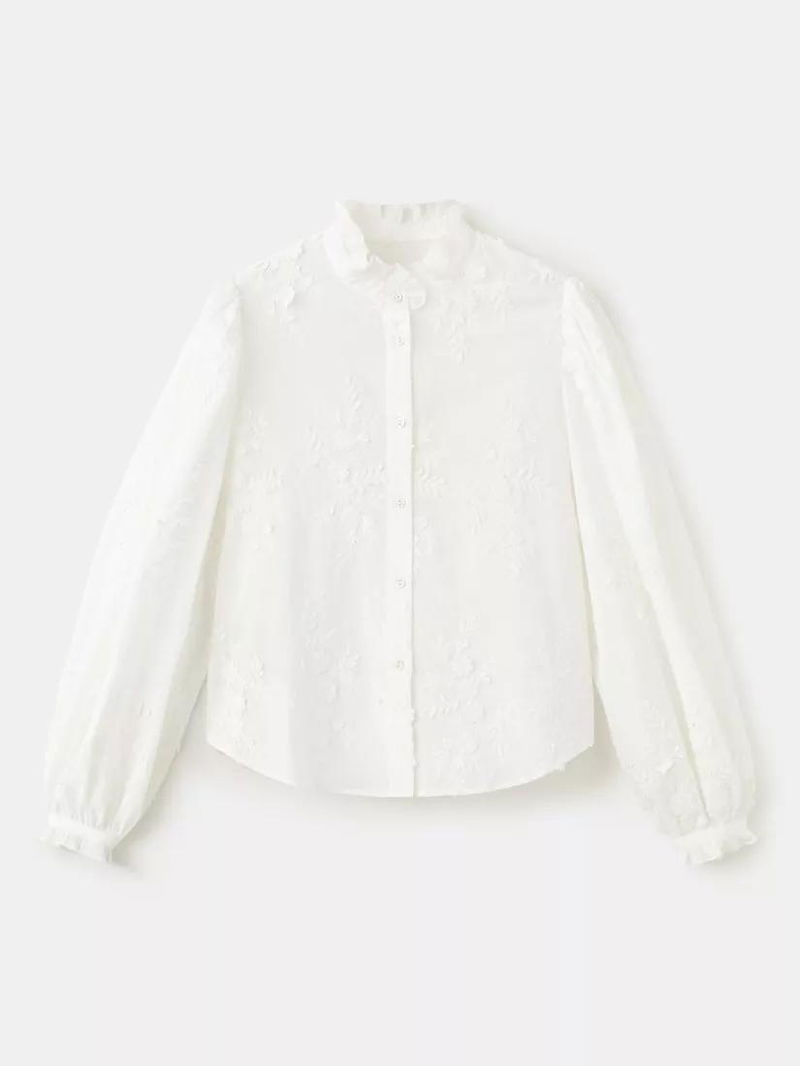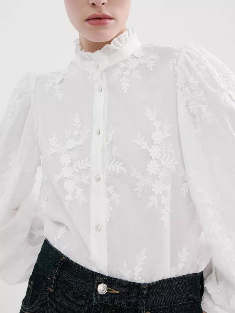 High Neck Embroidered Puff Sleeve Shirt, Off White