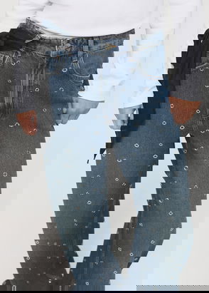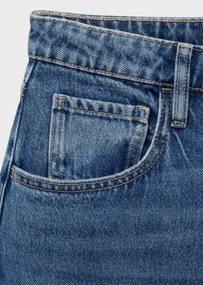 Denim-style cotton fabric. Long design. Balloon Design. Barrel style. High waist. Belt loops. Five pockets. Front zipper and button closure. Inside length 75 cm.