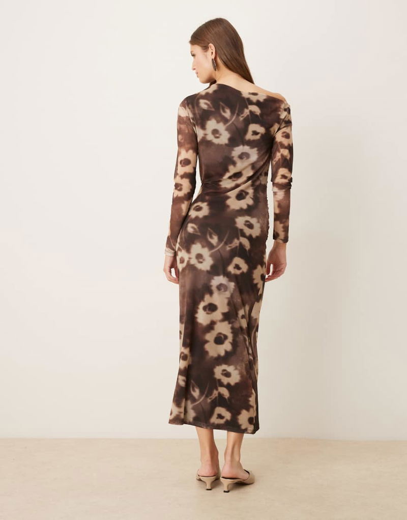 Long Sleeve Asymmetric Midi Dress In Blurred Floral Print