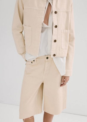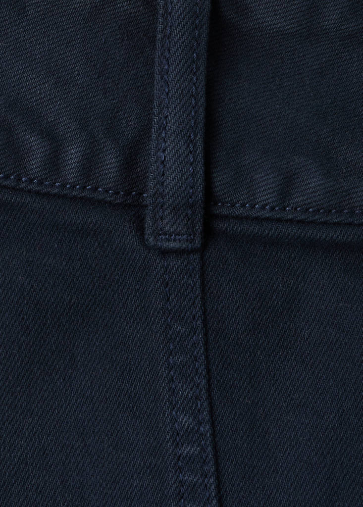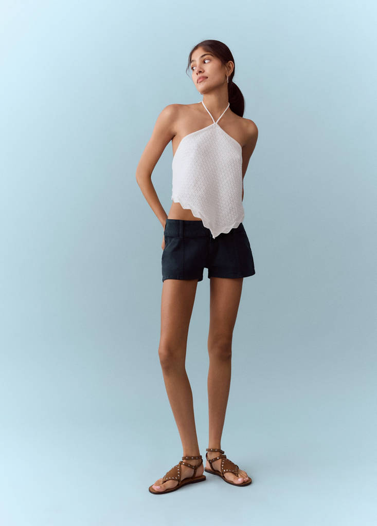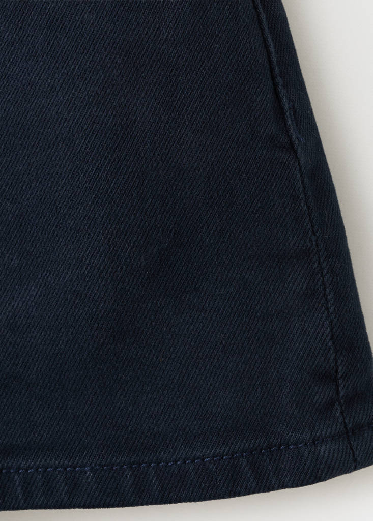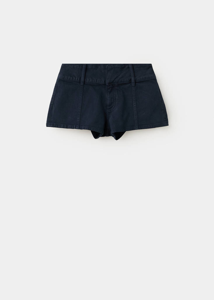 Denim-style cotton fabric. Straight design. Silhouette Mini. Low Waist Rise. Belt loops. Concealed hook and zip fastening. Seam detail