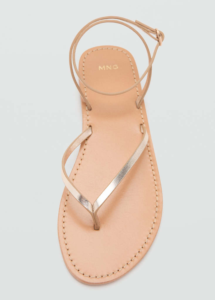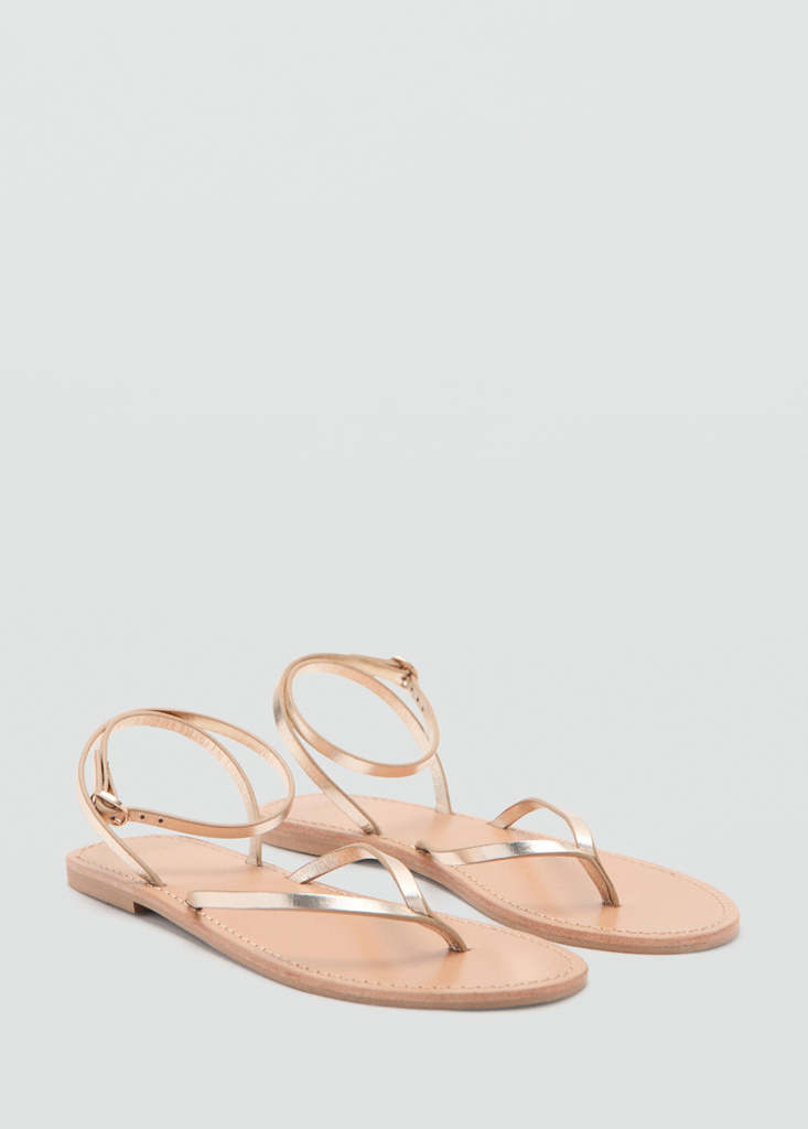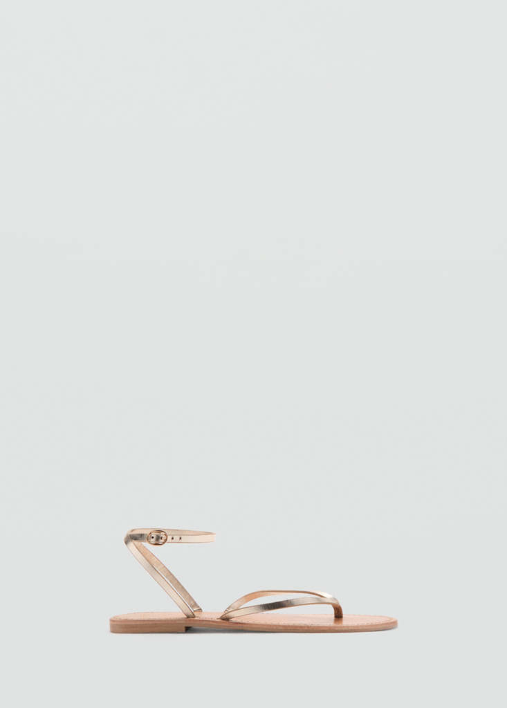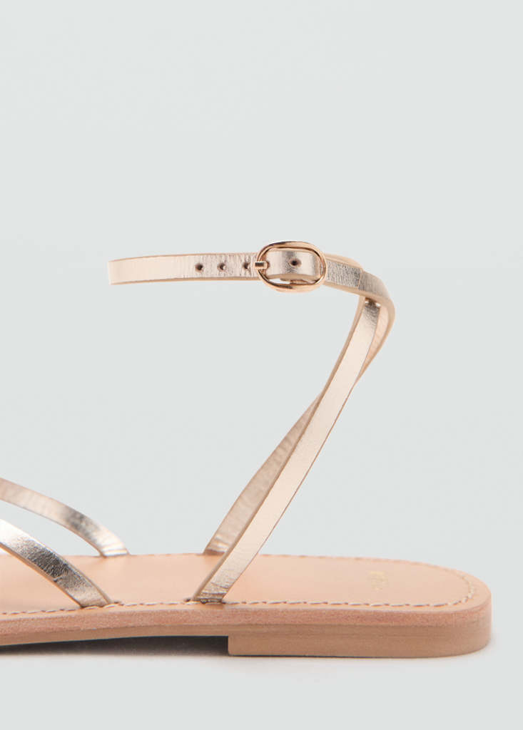 Flat. Metallic. Round toe. Strap closure with buckle.