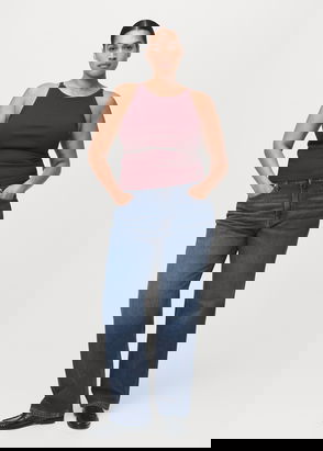 Denim-style cotton fabric. Long design. Straight Design. Mid-rise. Belt loops. Five pockets. Button and zip fastening. Inseam 82 cm.