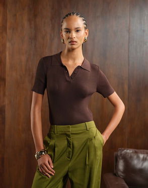 Nuez Open Knit Polo Knit Top, Medium Brown
