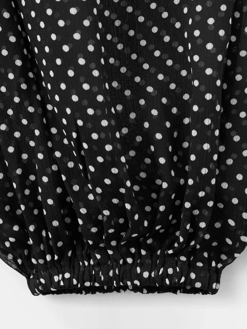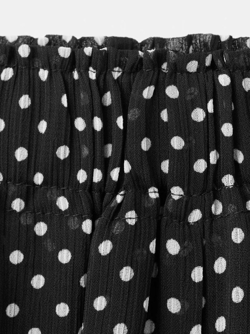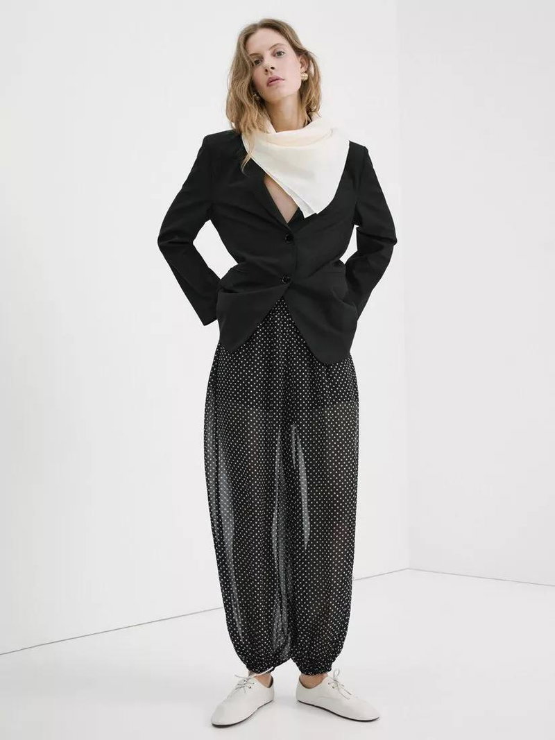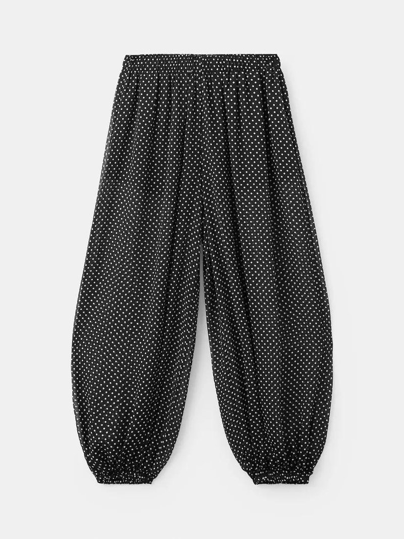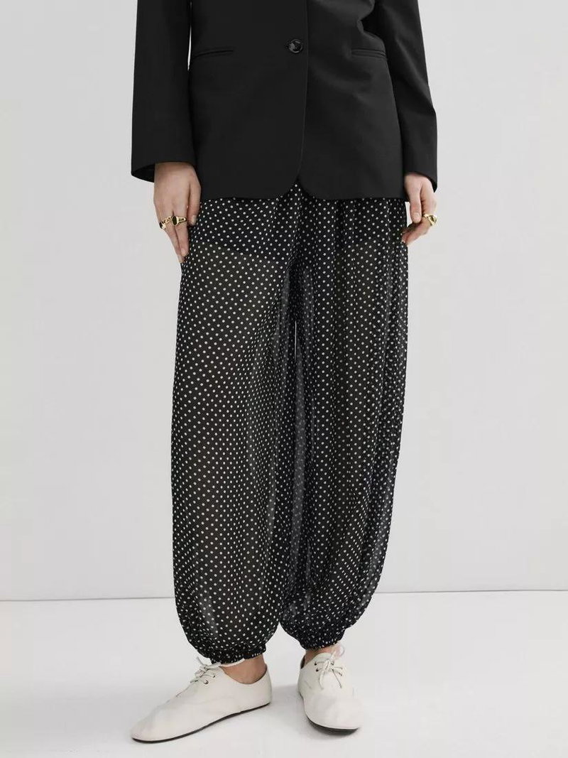 A pair of mid-rise tailored trousers, featuring a playful polka dot pattern and a comfortable loose barrel cut. Designed for all-day wear, they balance smart style with effortless ease for your everyday plans.