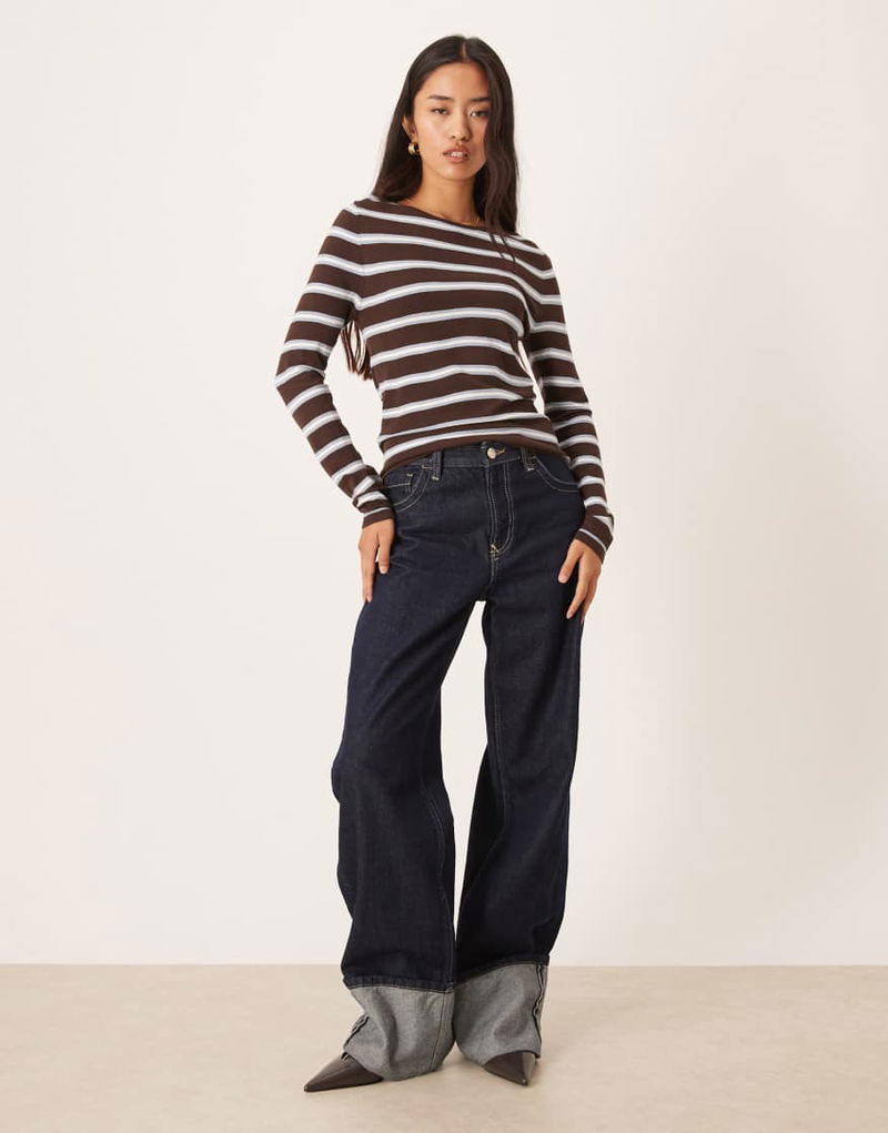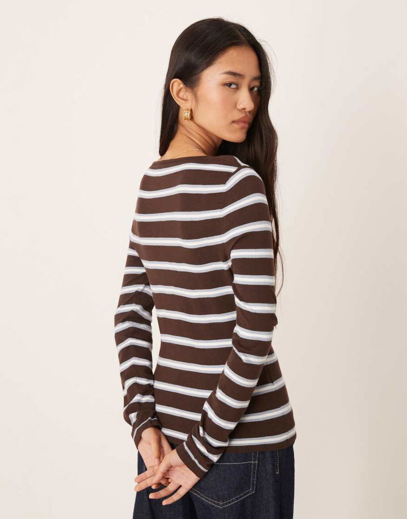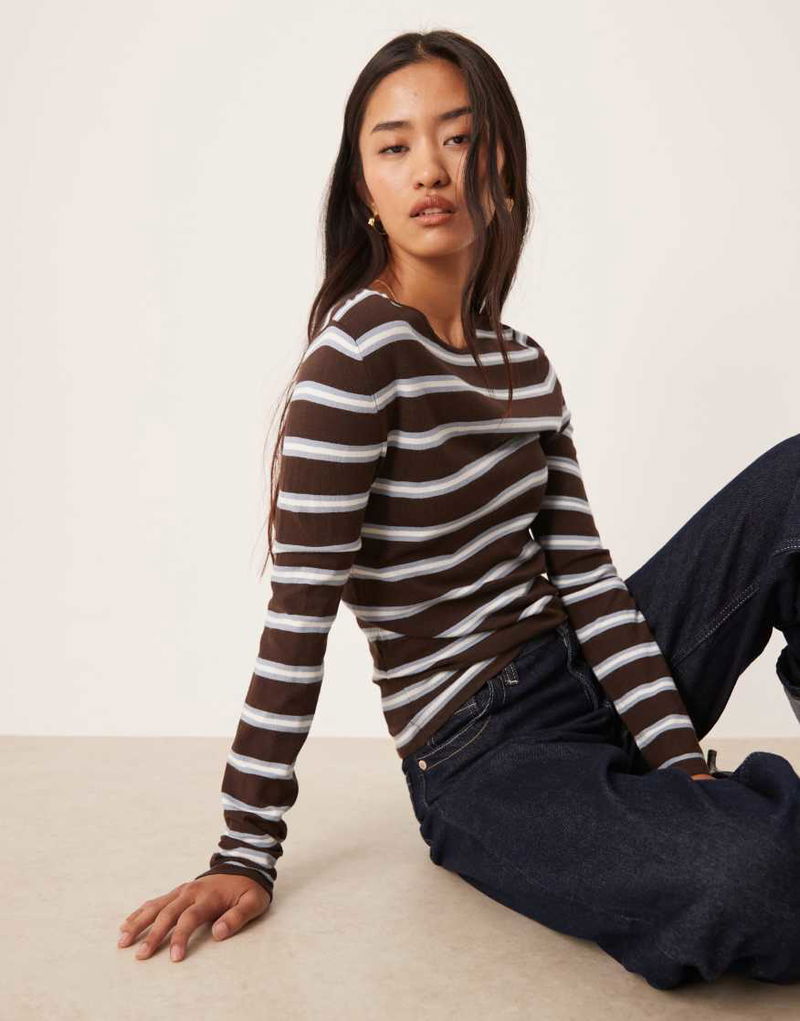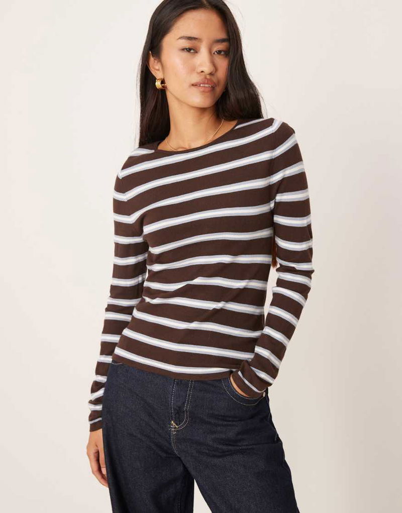 Round Neck Fine Knit Top In Brown And Blue Stripe