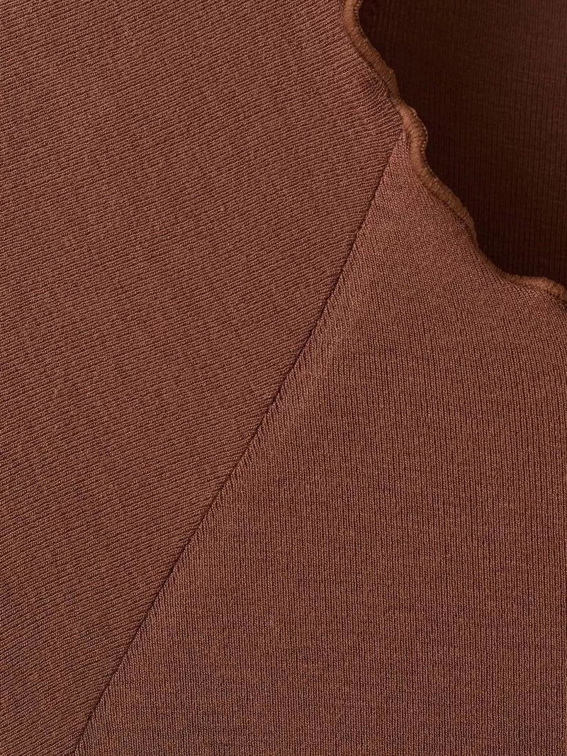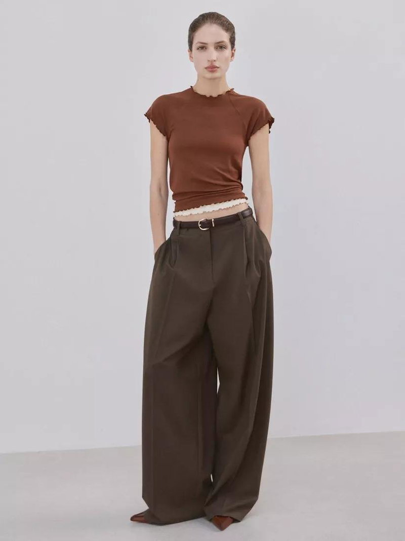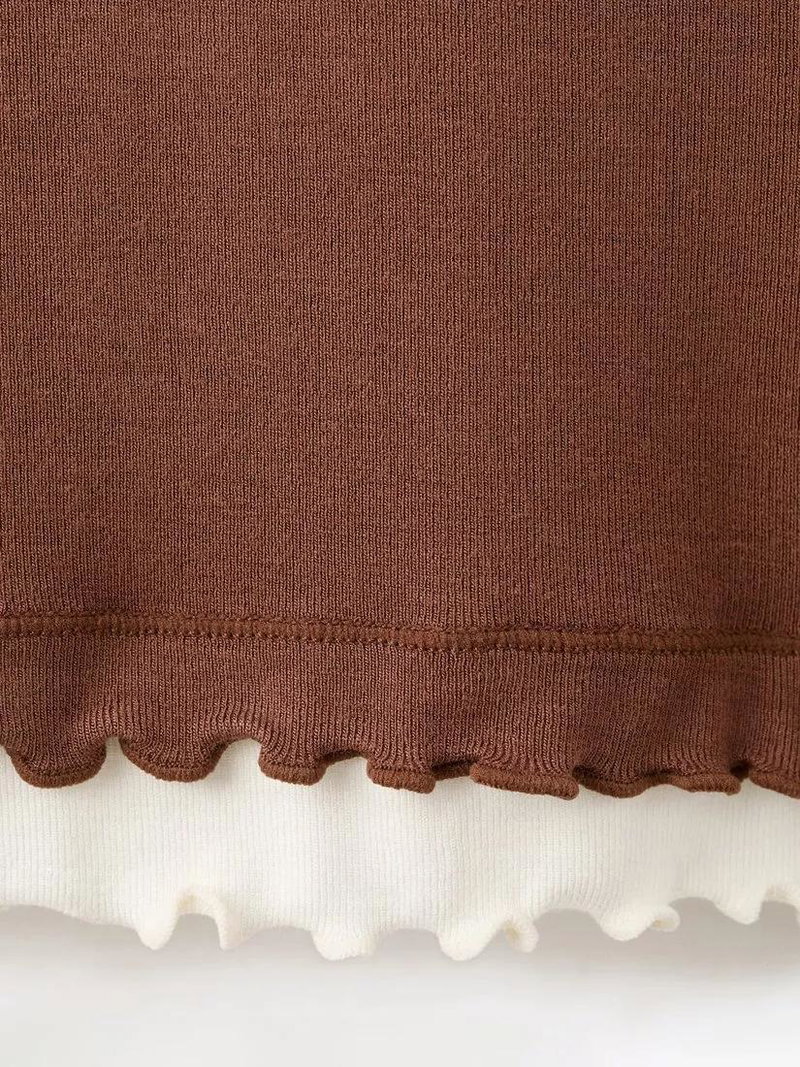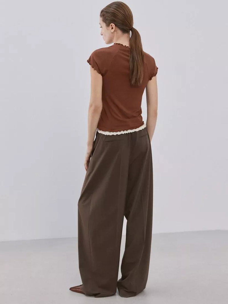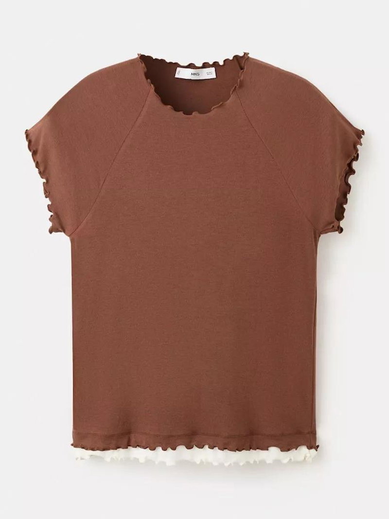 Round Neck Ruffle Trim T-Shirt, Brown