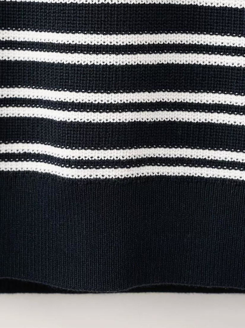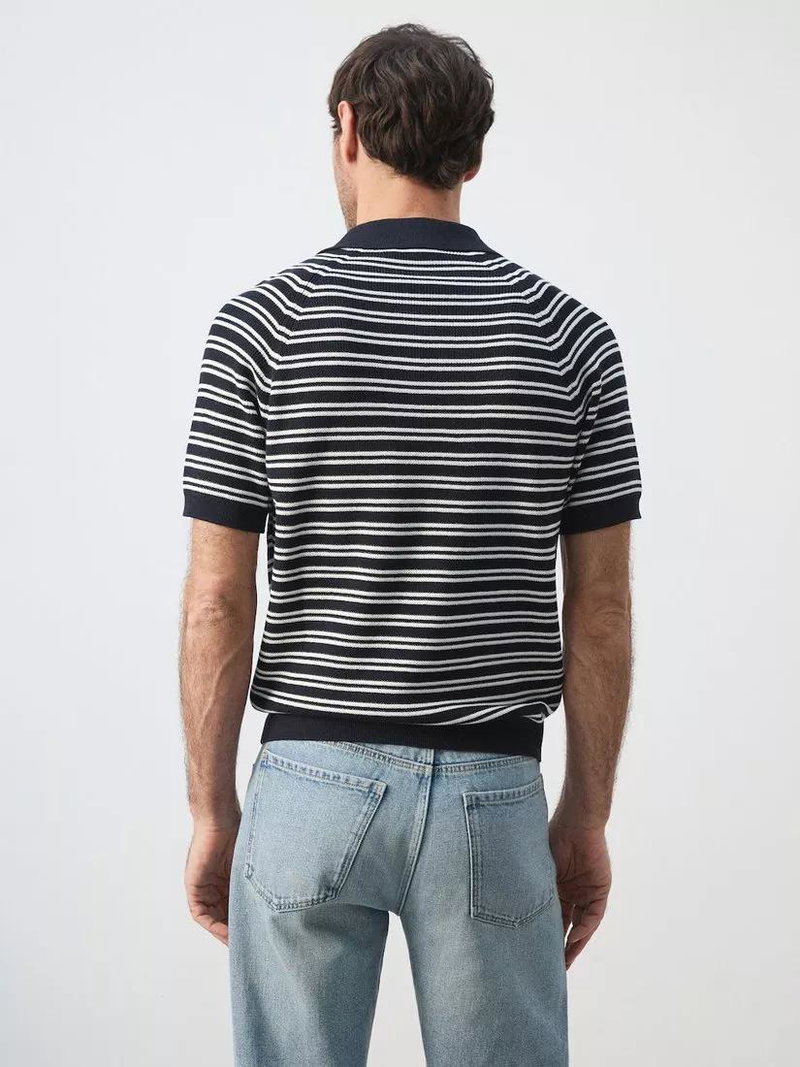 Short Sleeve Striped Knit Cotton Polo Shirt, Navy