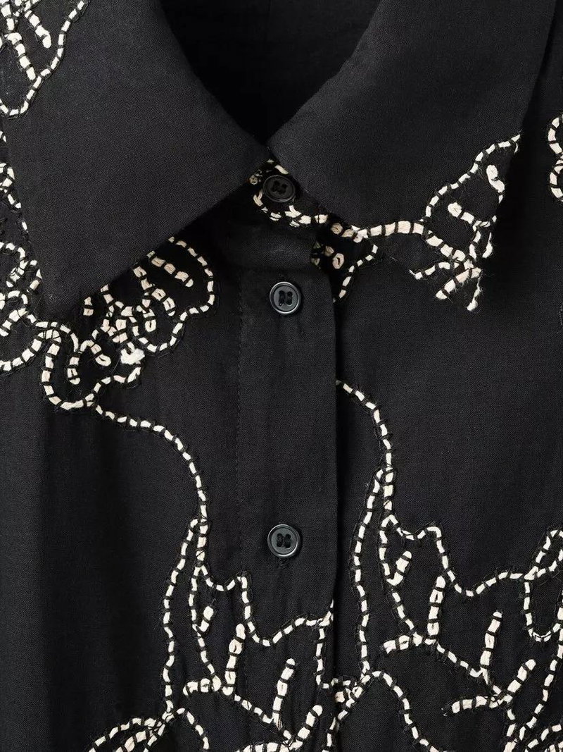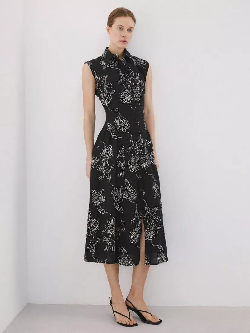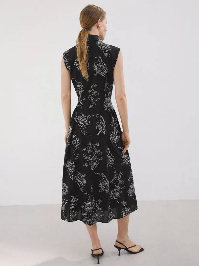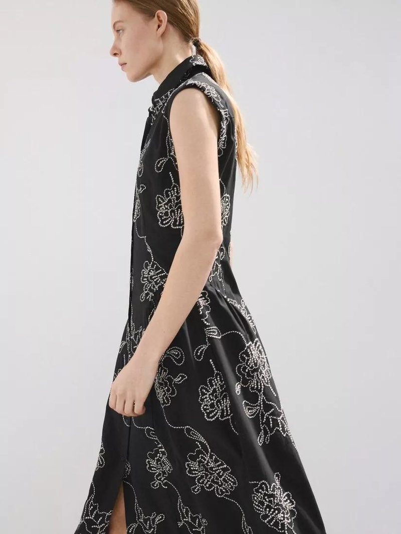 Sleeveless Embroidered Shirt Midi Dress, Black