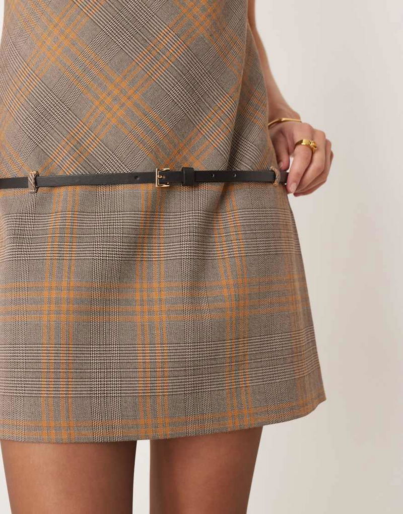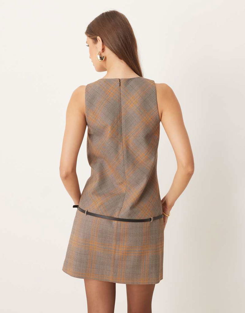 Sleeveless Tailored Mini Dress With Belt In Brown Check