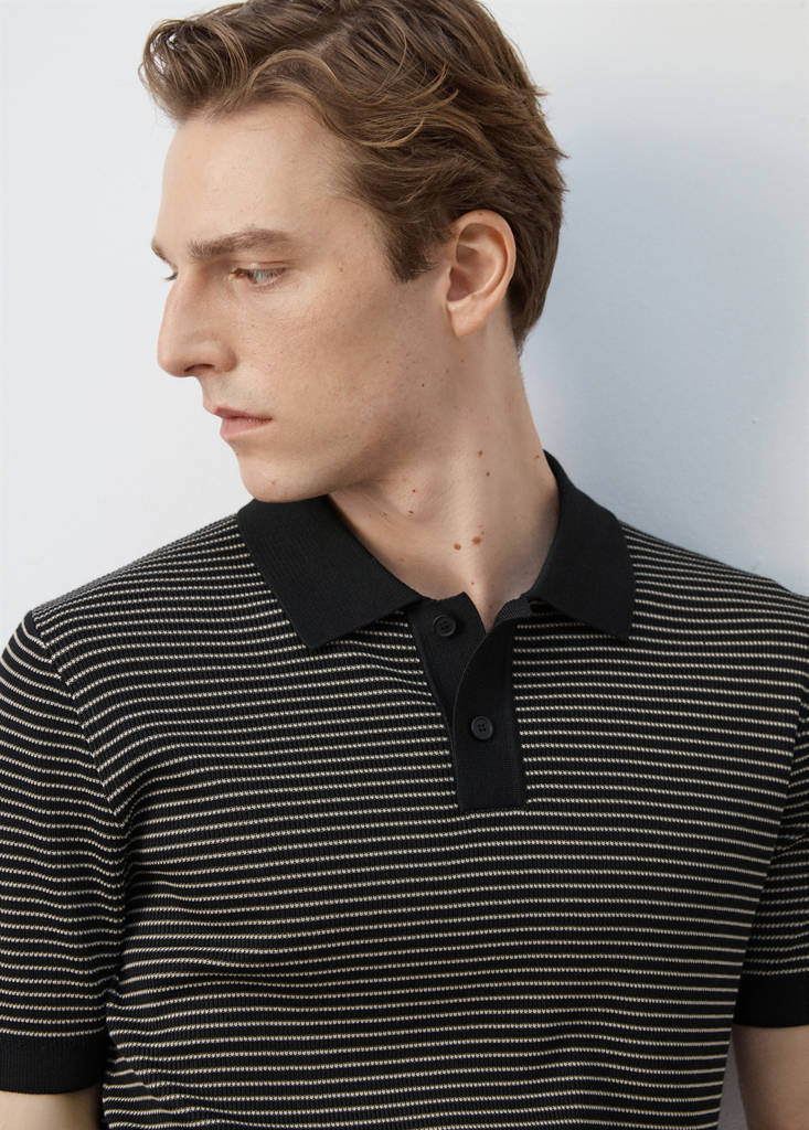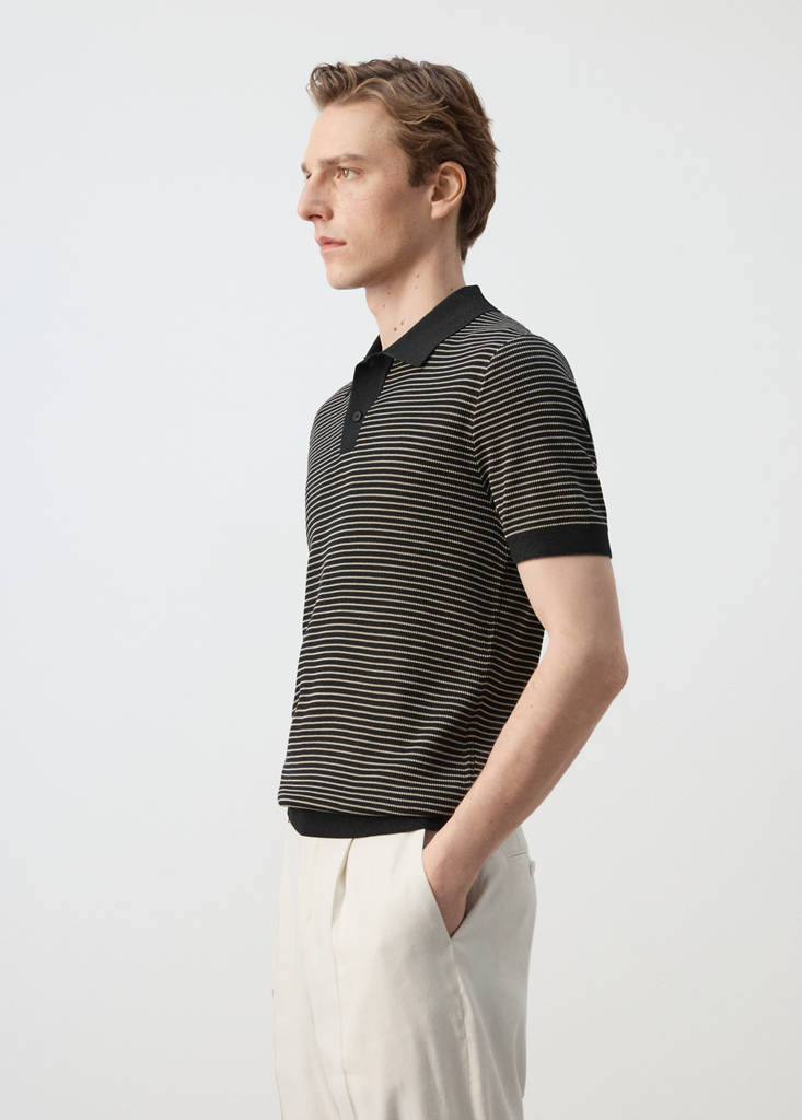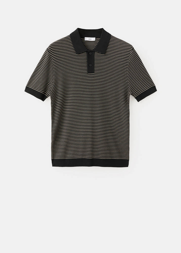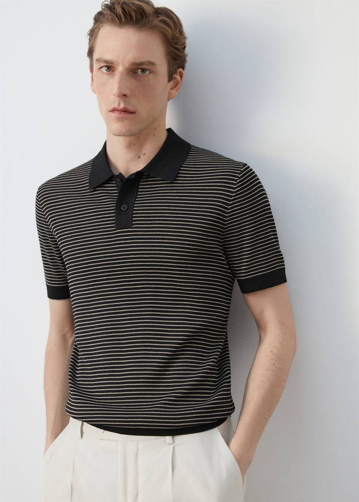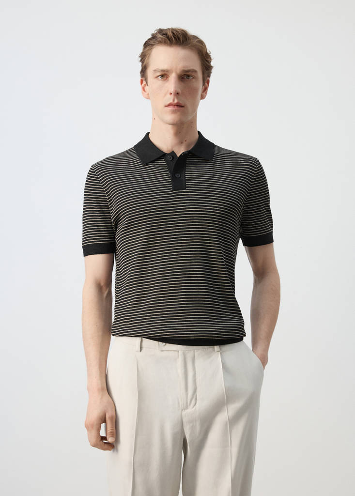 Cotton blend fabric. Regular fit. Standard Length. Striped design. Polo-neck with button closure. Straight hem.