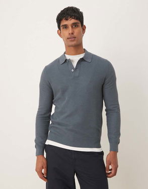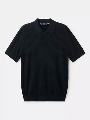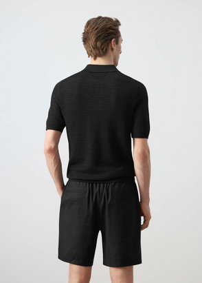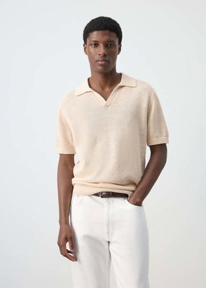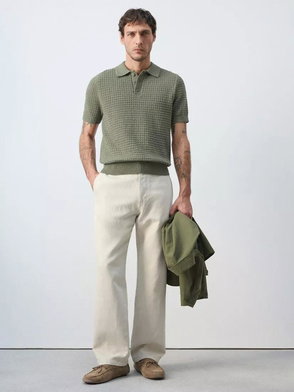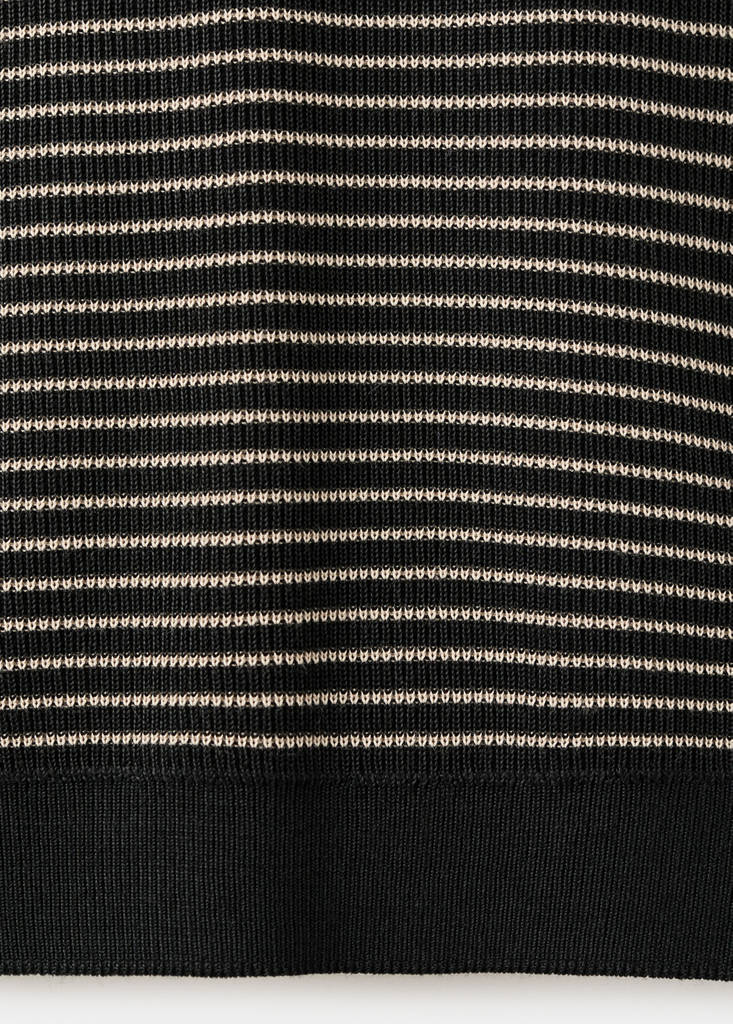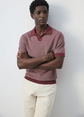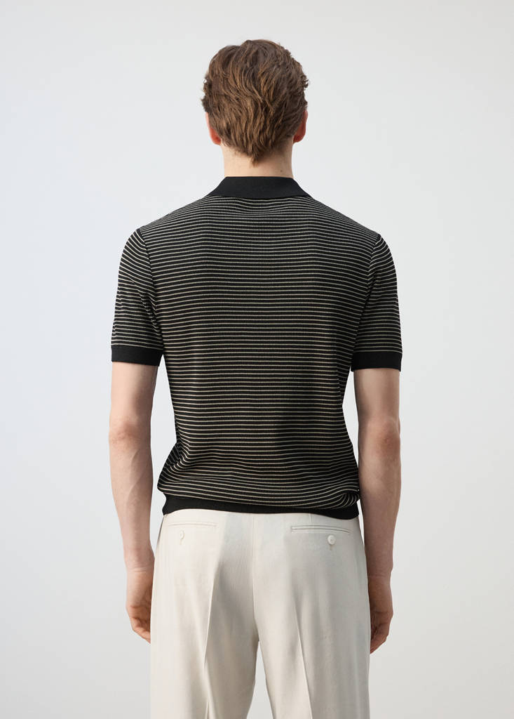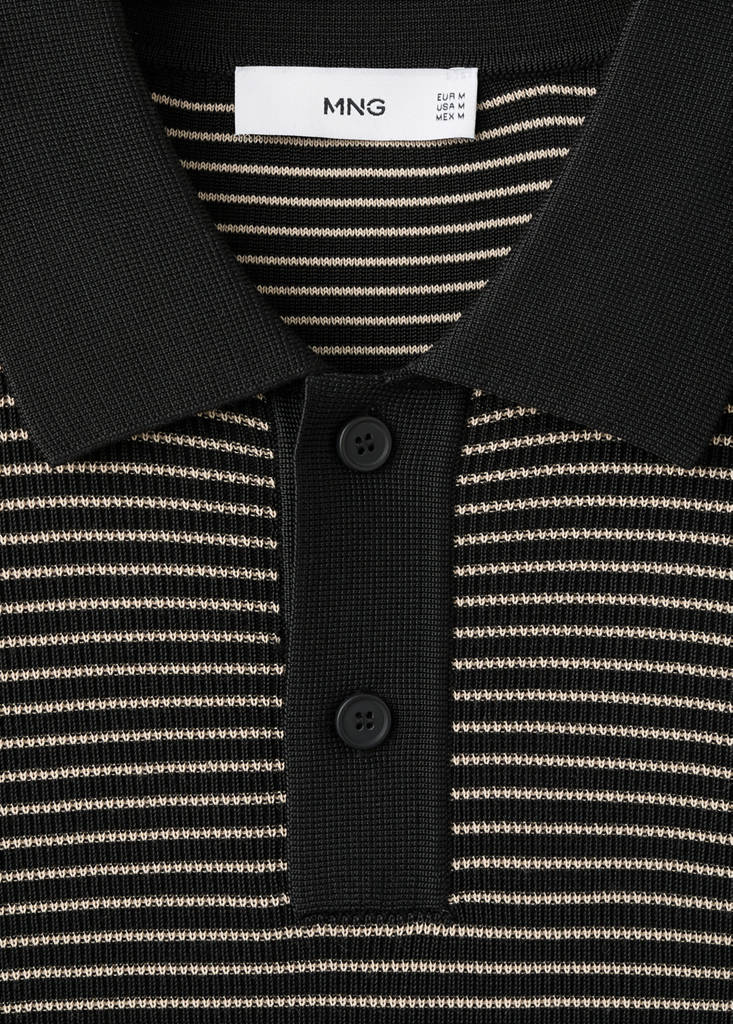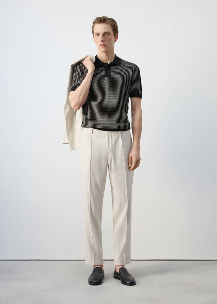 Cotton blend fabric. Regular fit. Standard Length. Striped design. Polo-neck with button closure. Straight hem.