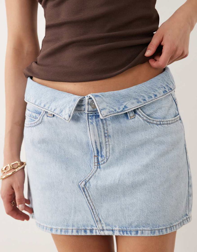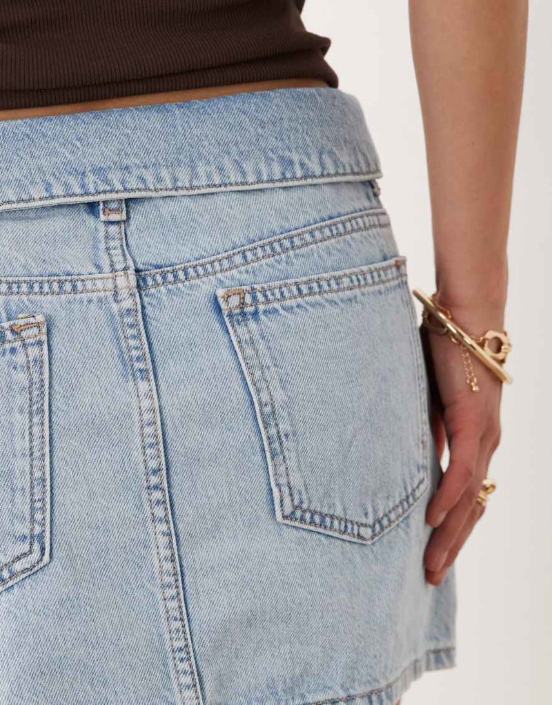 Teen 100% Cotton Folded Waist Denim Mini Skirt In Bleach Wash