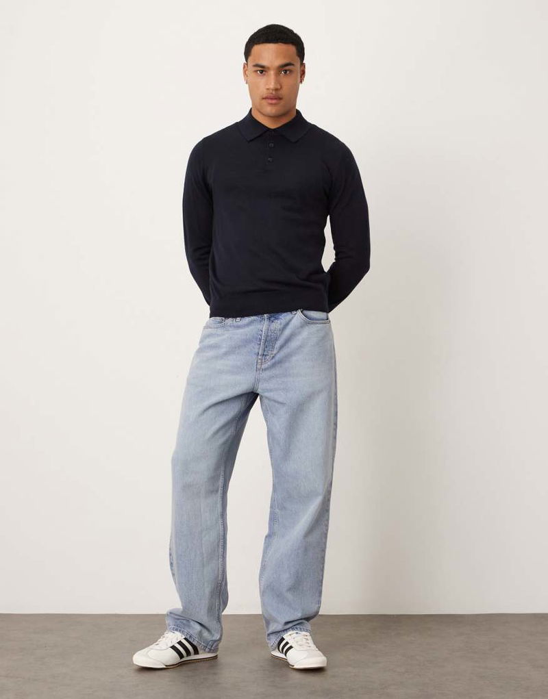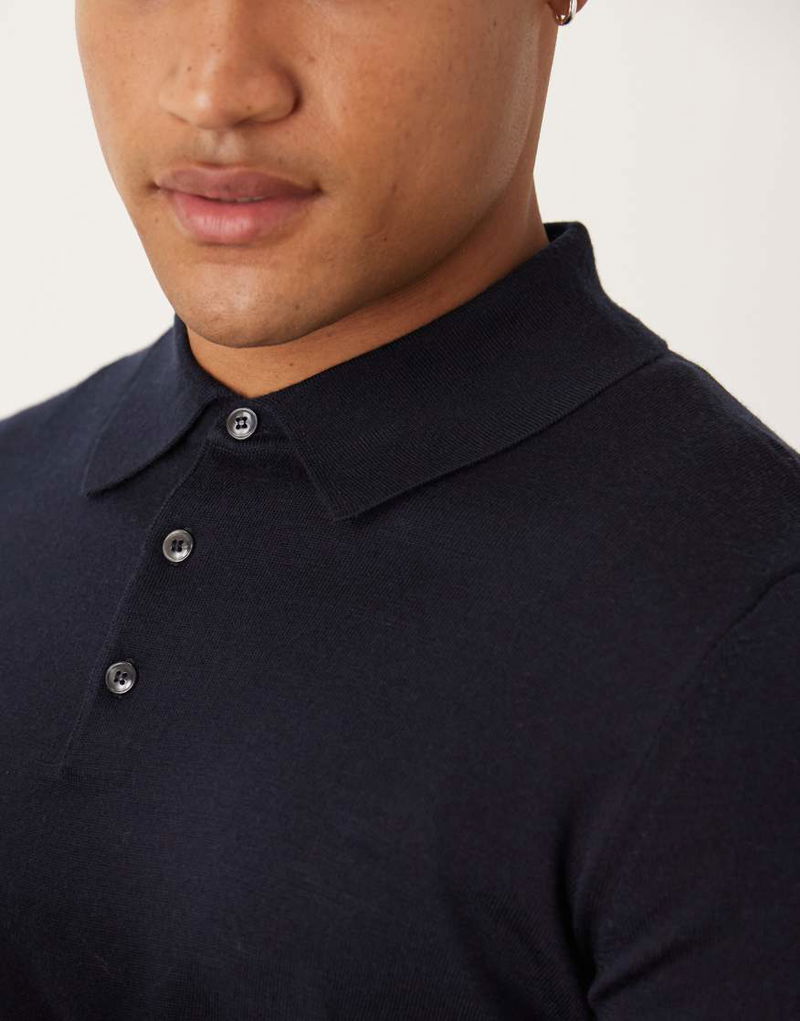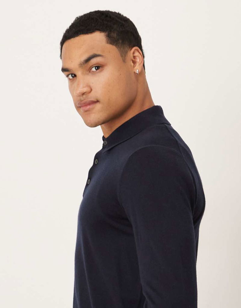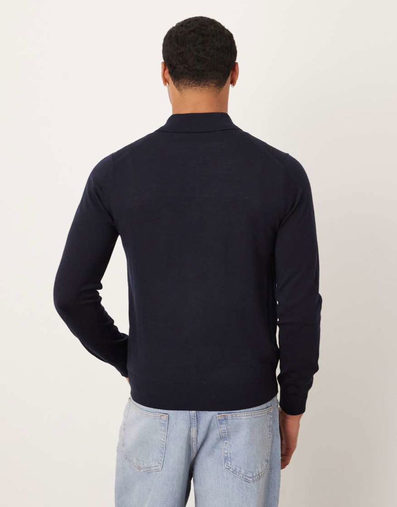 Wool Button Up Long Sleeve Knitted Polo Top In Navy