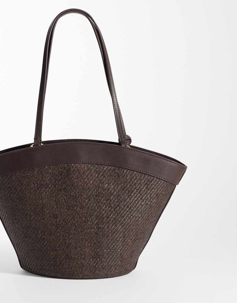 Woven Shoulder Bag With Faux Leather Trim In Brown