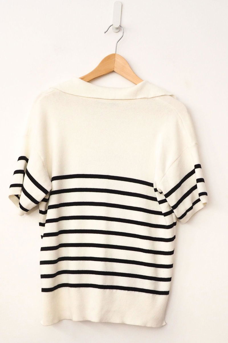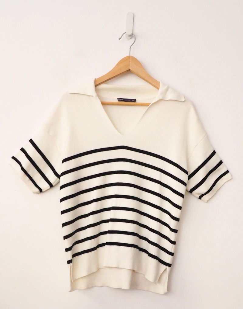 For a breathable feel, this knitted top is made from cotton-rich material. It's designed in an easy regular fit, with a neat ribbed texture and an all-over striped pattern to create a stylish look. The short sleeves make it comfortable throughout the day, while the collared neck provides a smart finish.