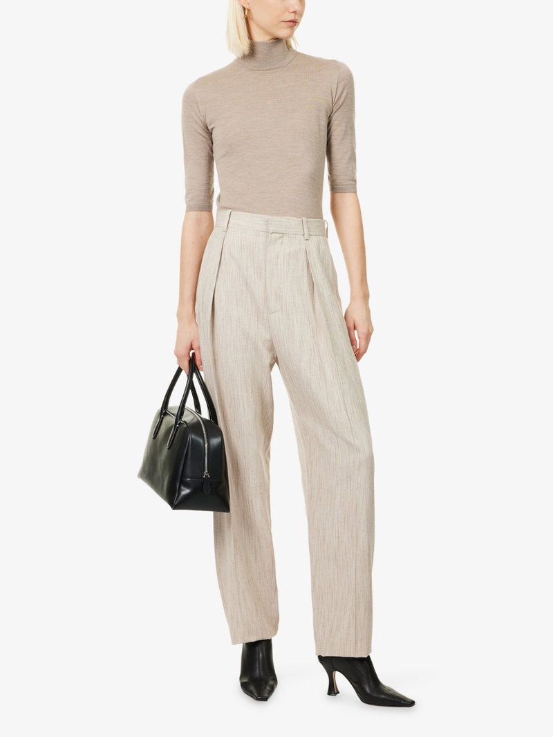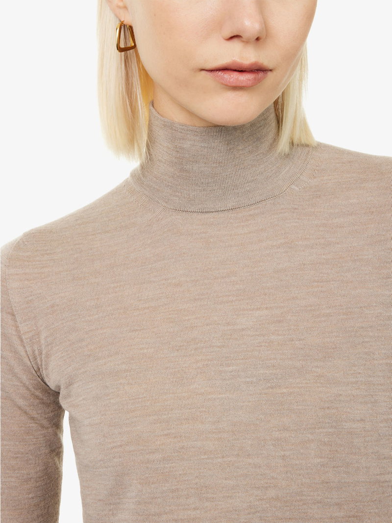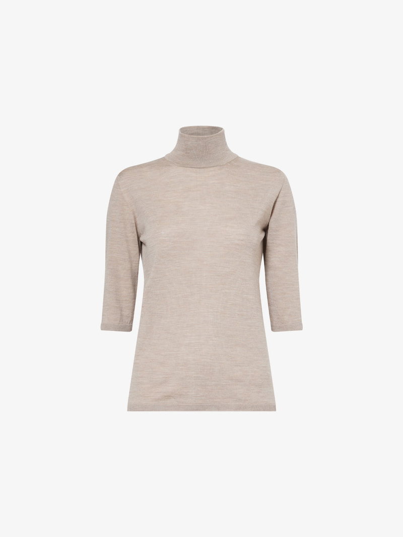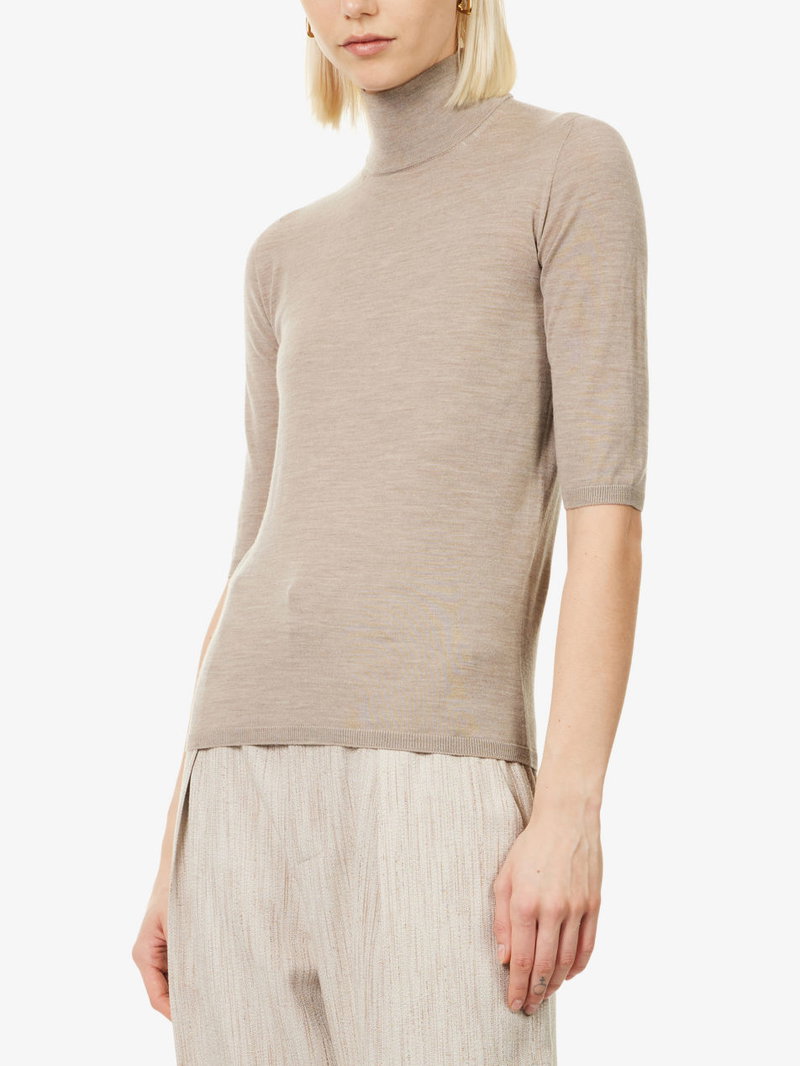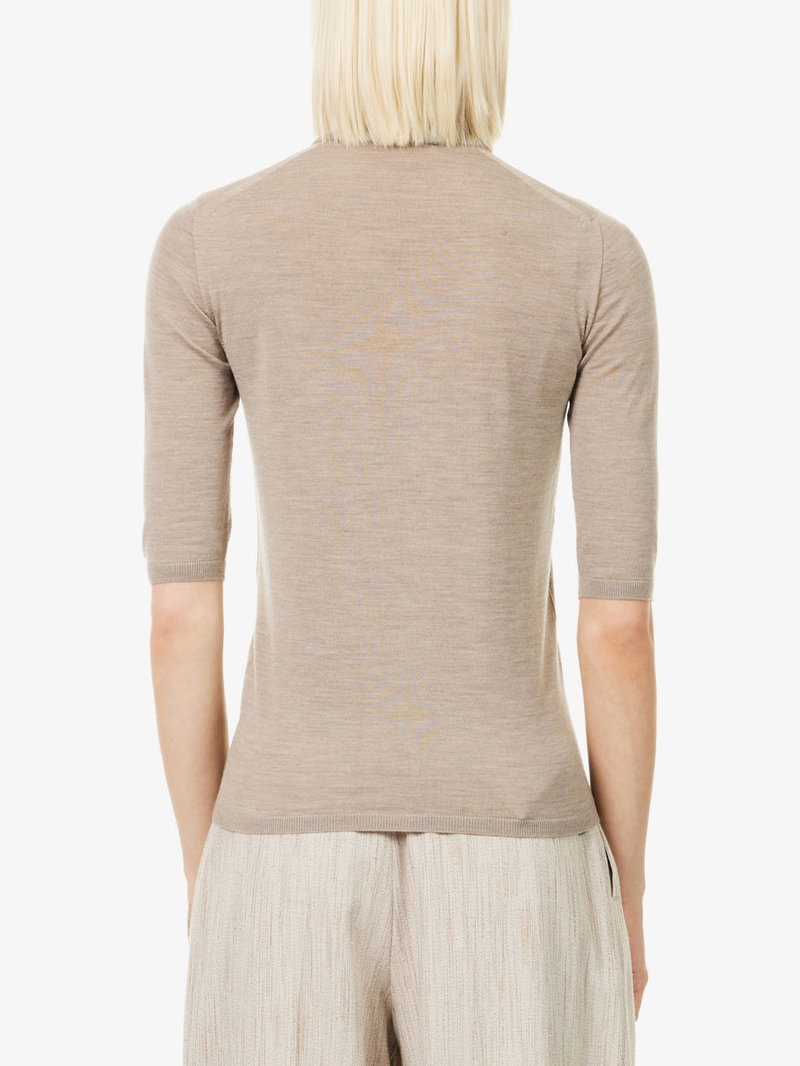 Max Mara wool knitted top. Regular fit, high polo neck, quarter sleeves, fine-knit texture, ribbed trims.
