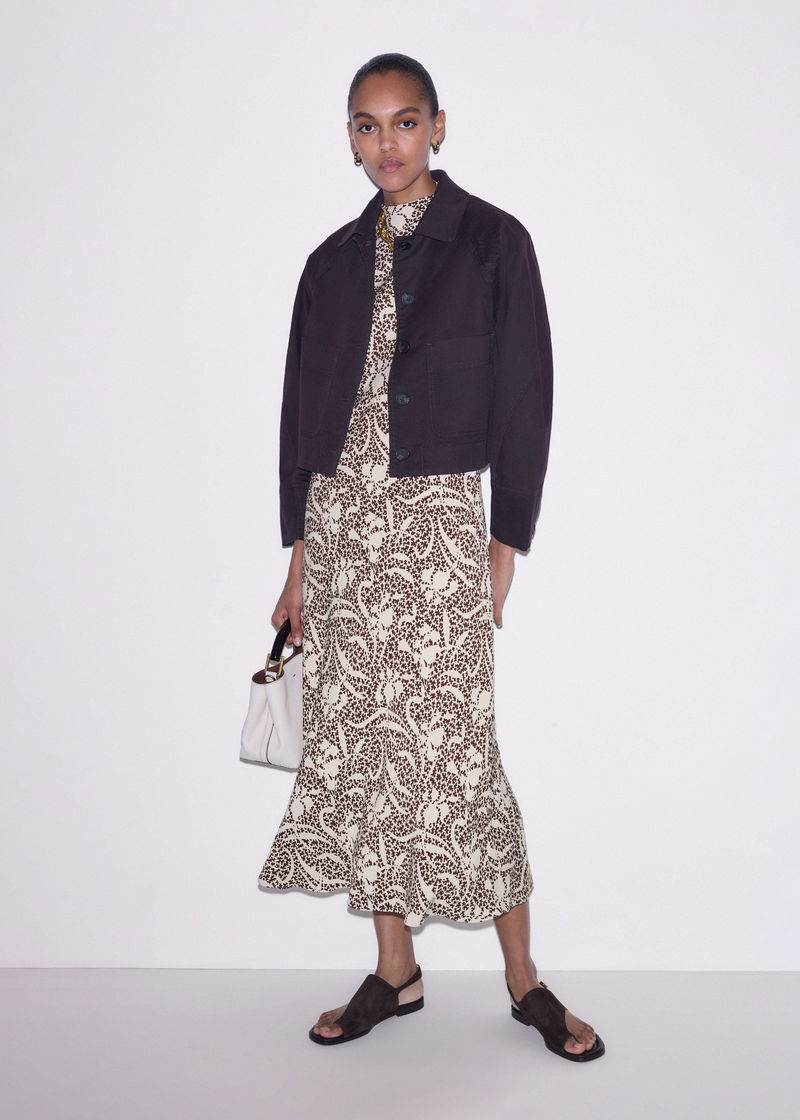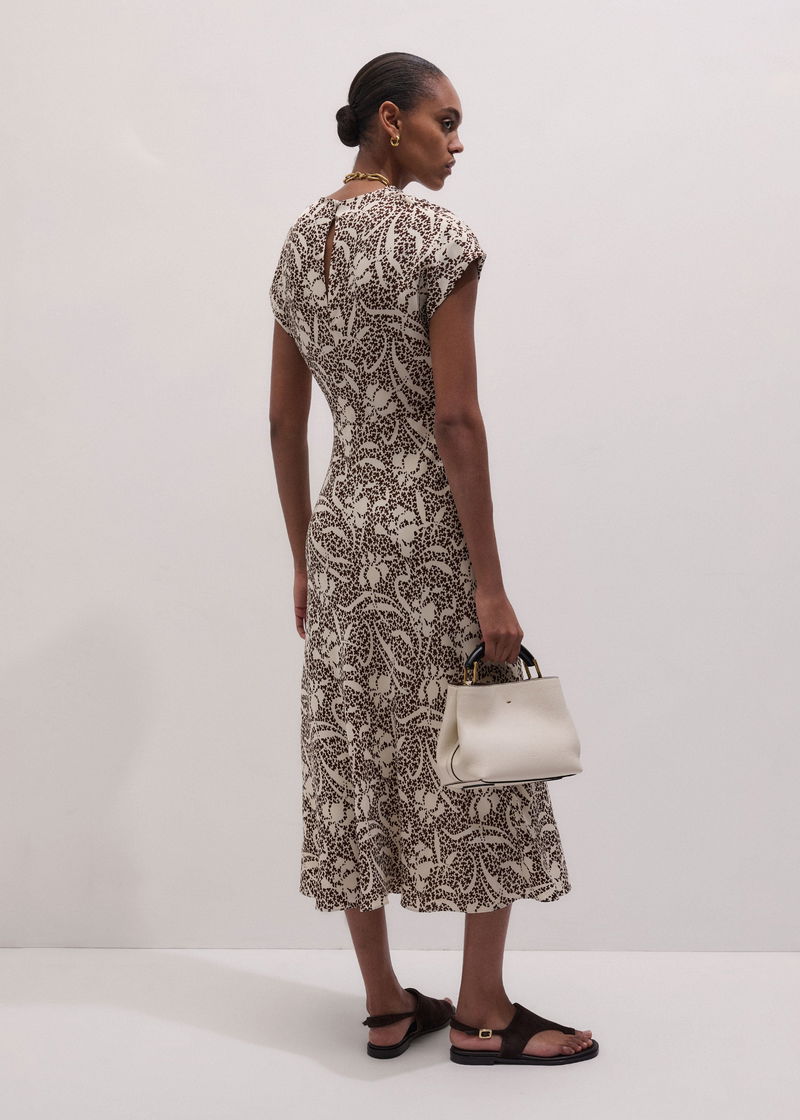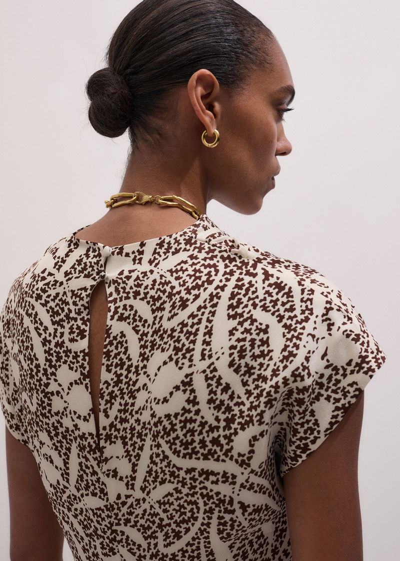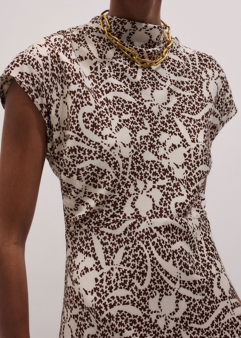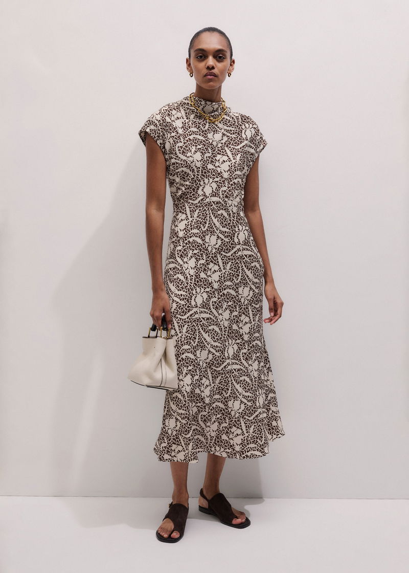 ME+EM's Brown Speckled Bloom Print Bias Cut Maxi Dress is designed with short cap sleeves and falls to a bias cut silhouette.