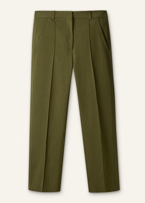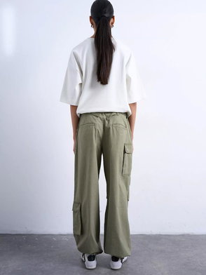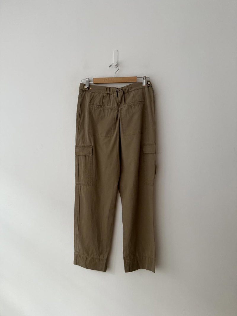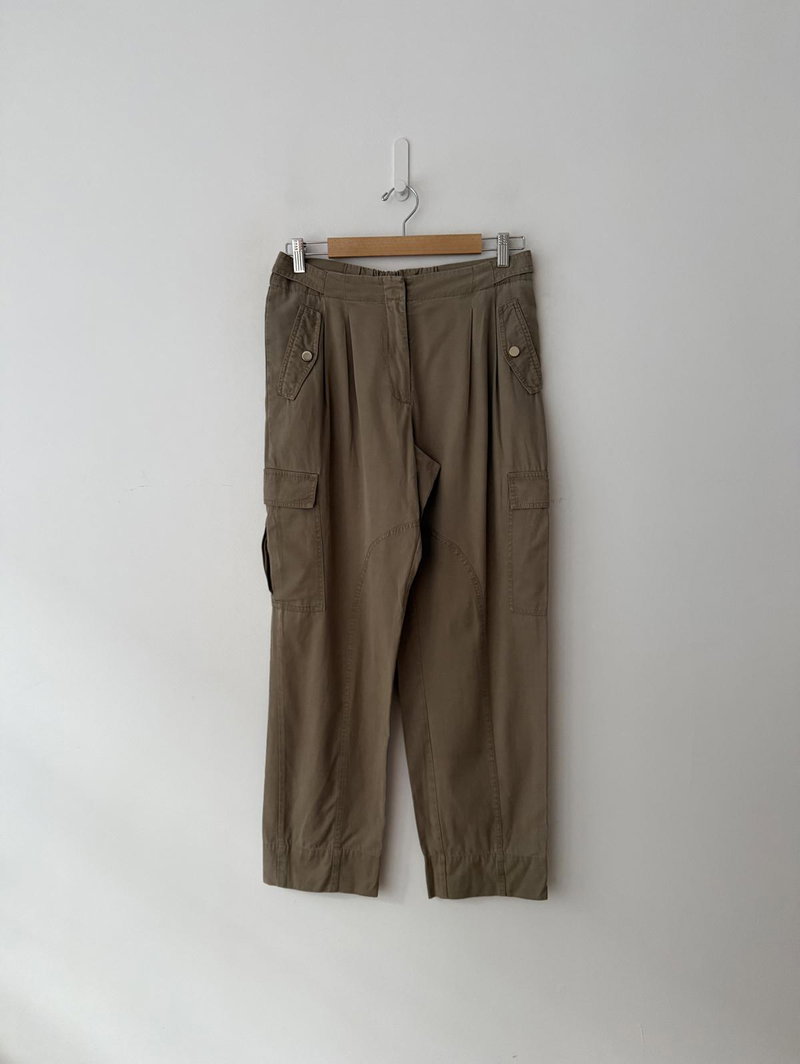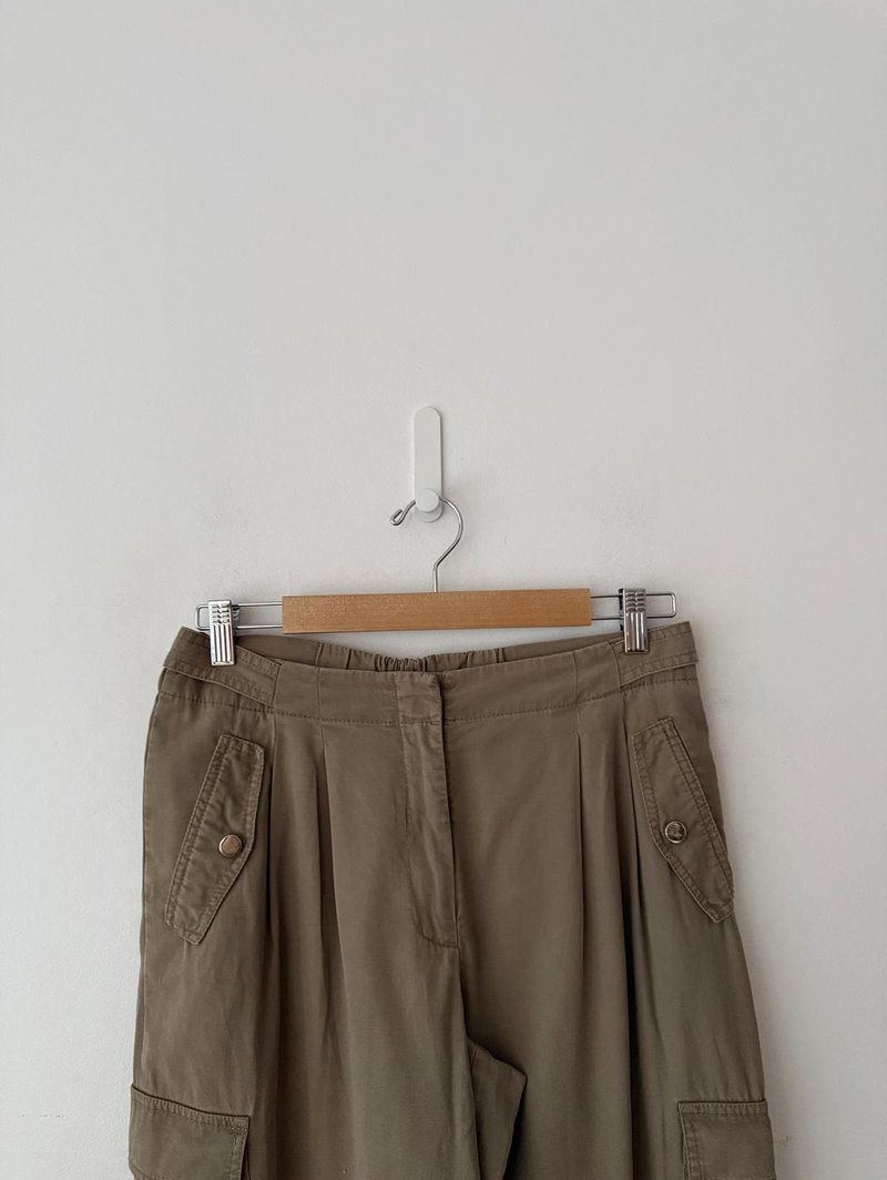 Khaki green cargo utility trousers with side pockets and zip front fastening.