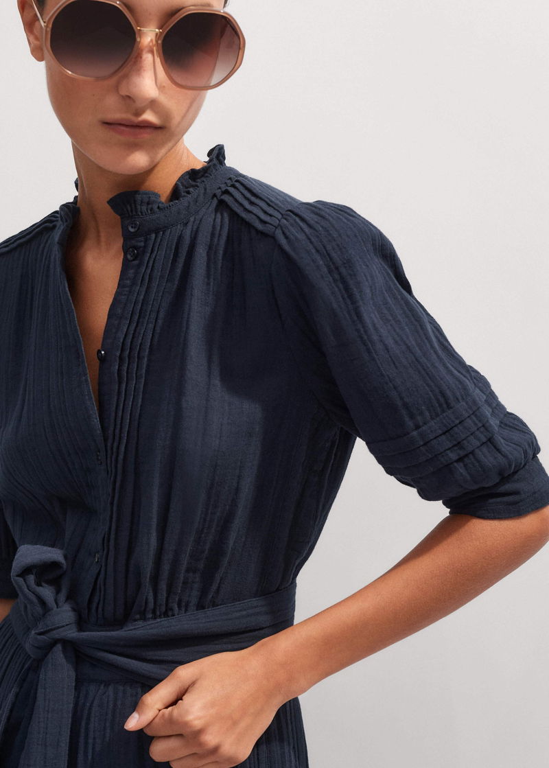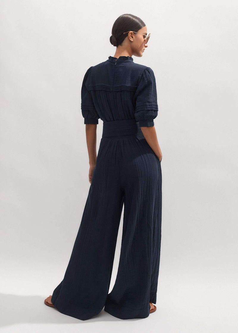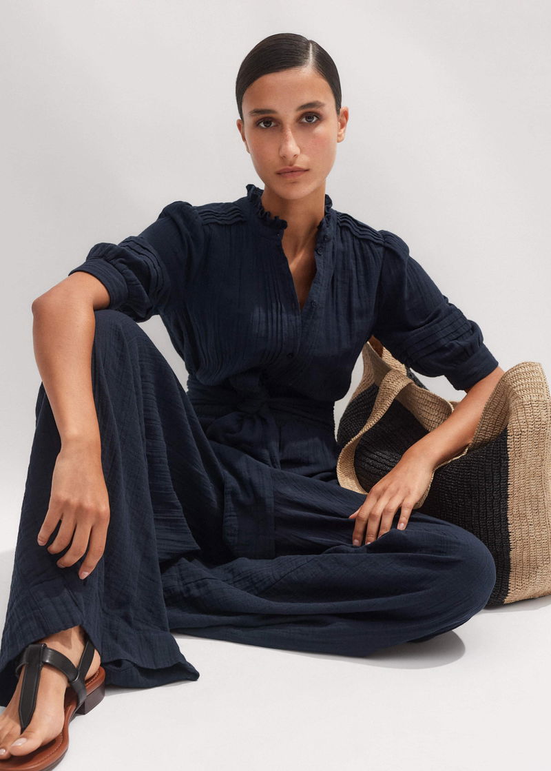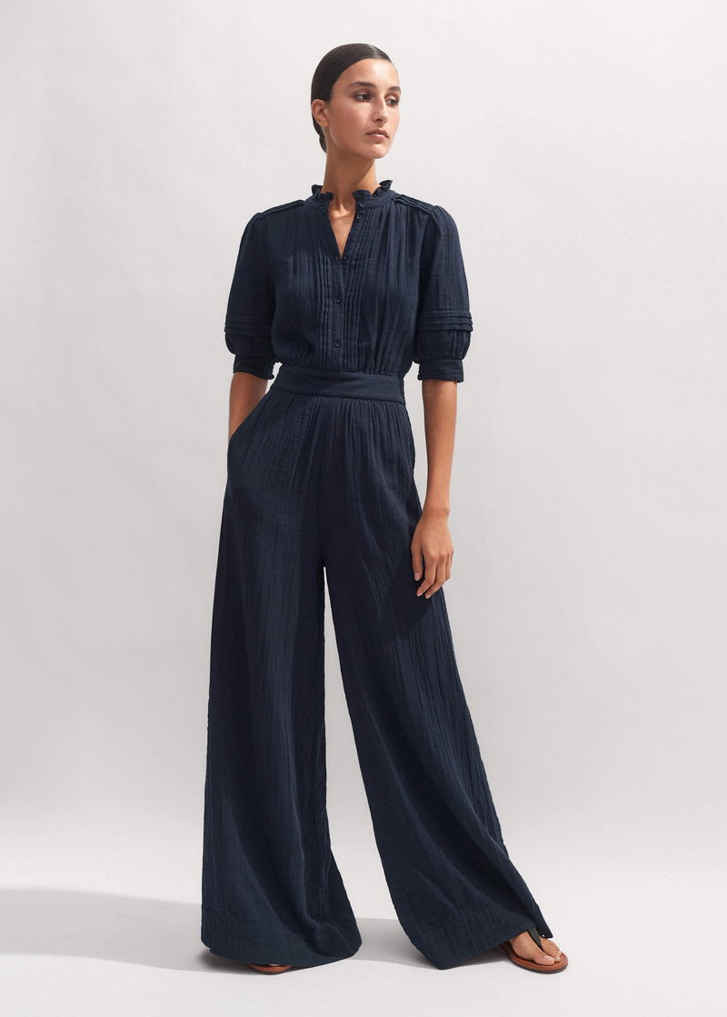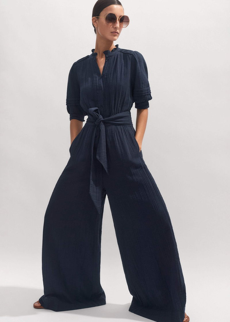 ME+EM's Navy Cheesecloth Frill Detail Jumpsuit + Belt is crafted from breathable cotton cheesecloth that is naturally textured and therefore iron-free, perfect for packing in your suitcase. Shop now. ME+EM Cheesecloth Frill Detail Jumpsuit + Belt Navy