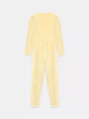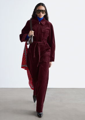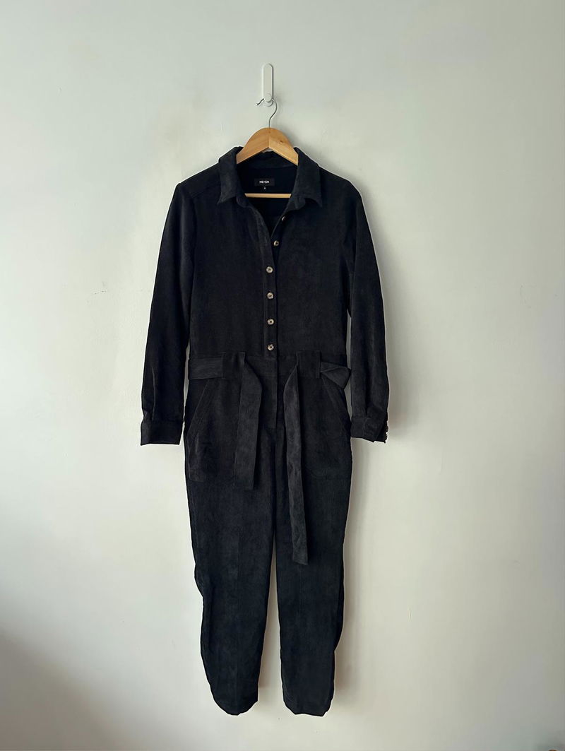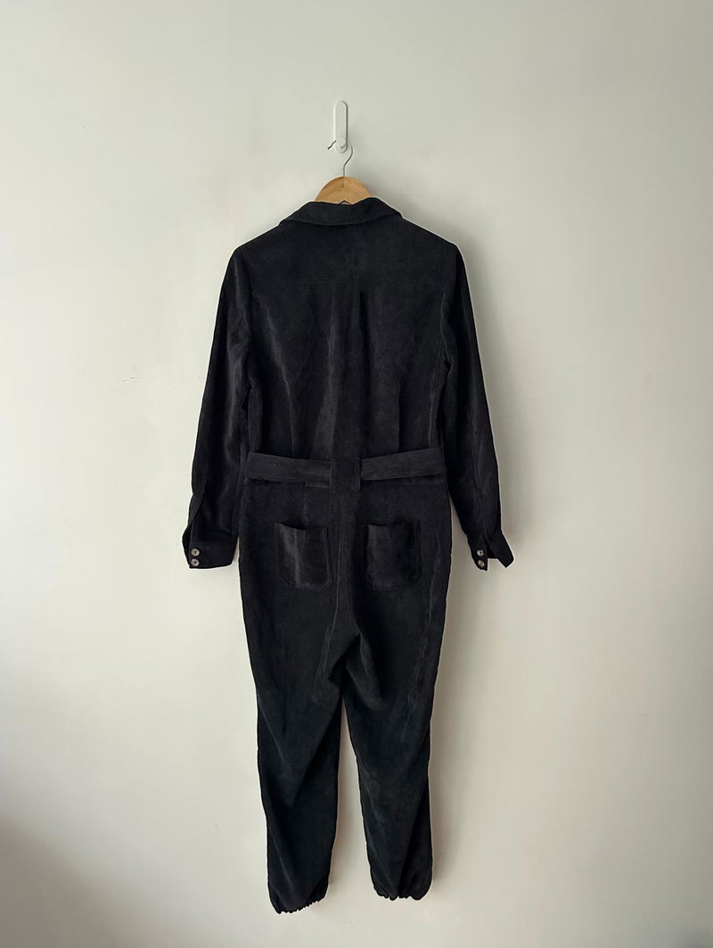 Black soft cord button-up jumpsuit, tie waist and cuffed hem.