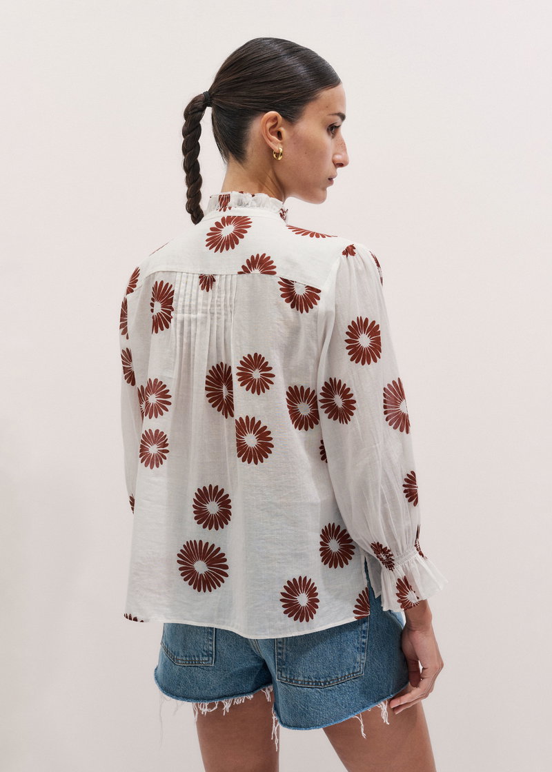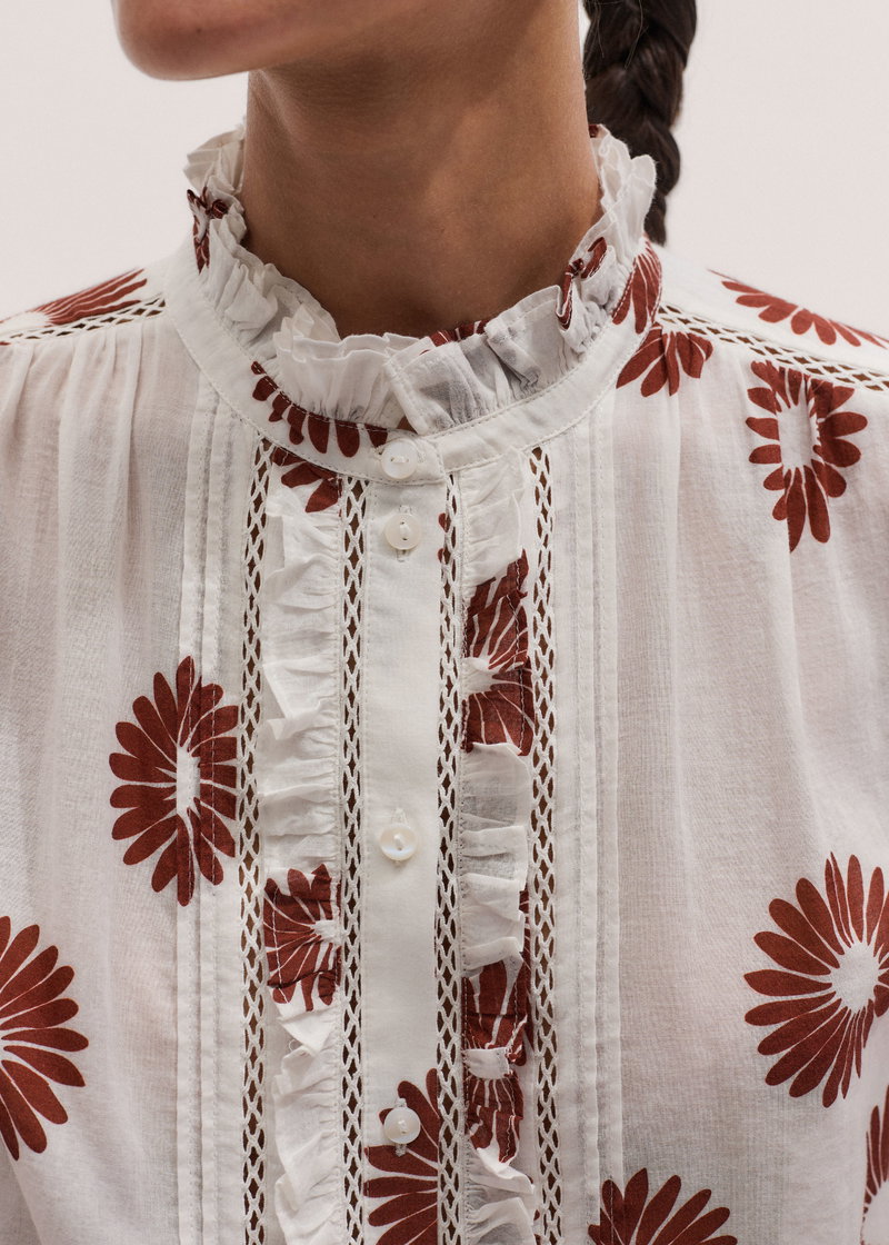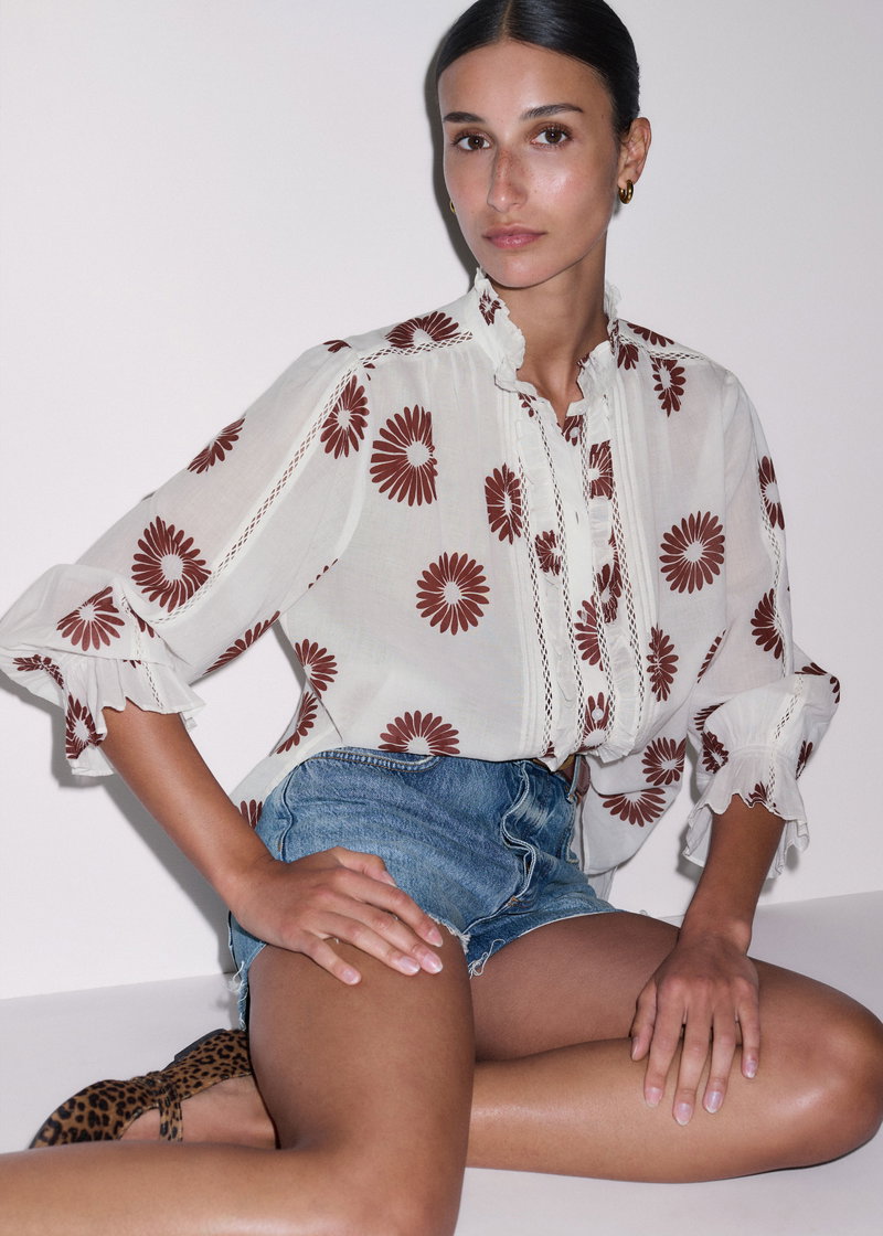 ME+EM's Cream Summer Swing Blouse is elevated with cutwork trims, a frilled neckline and bracelet-length sleeves.