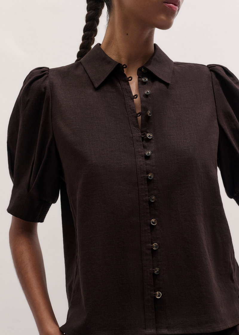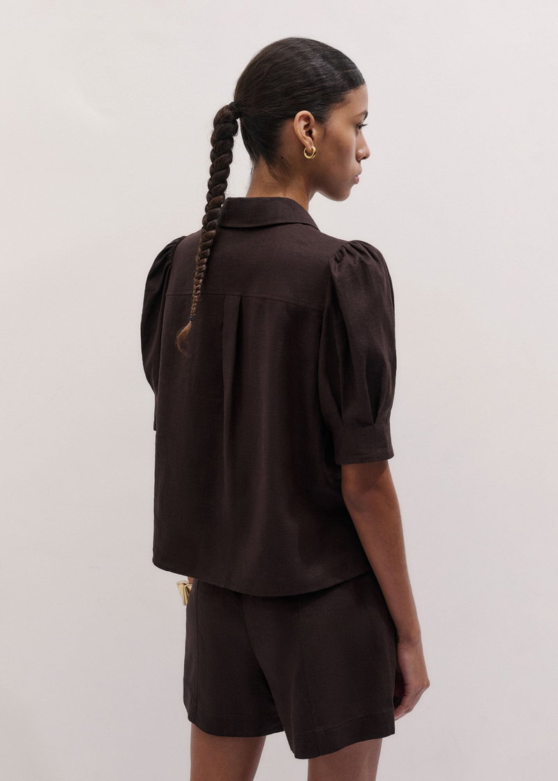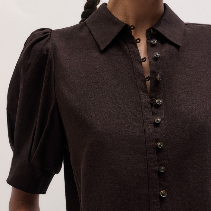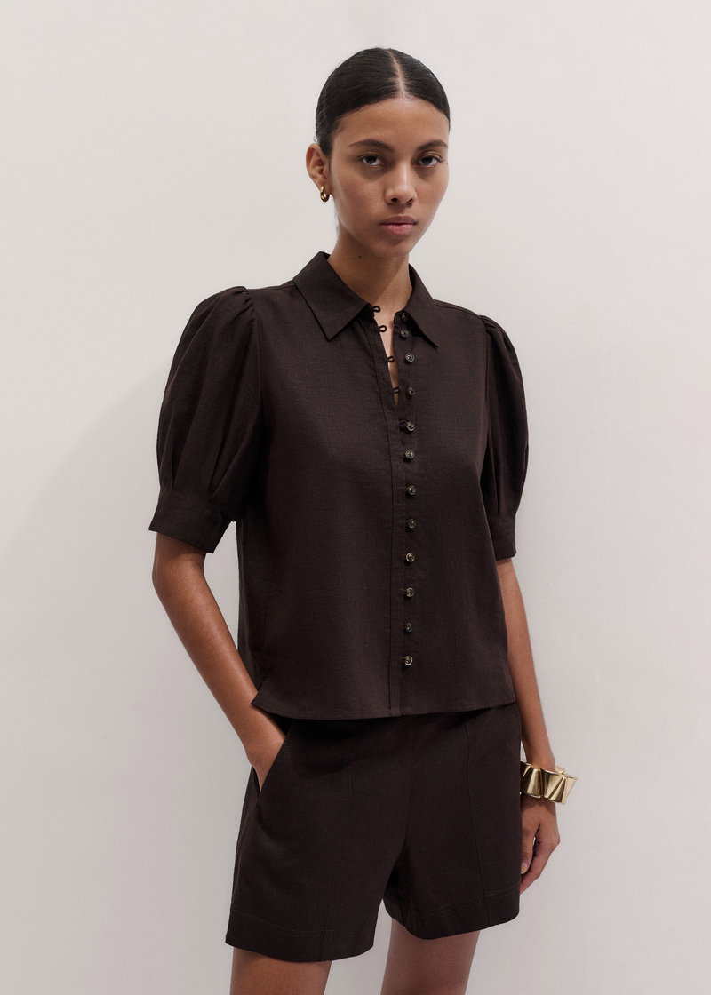 ME+EM's Brown Feminine Sleeve Blouse is crafted from linen imbued with viscose to minimise creasing.