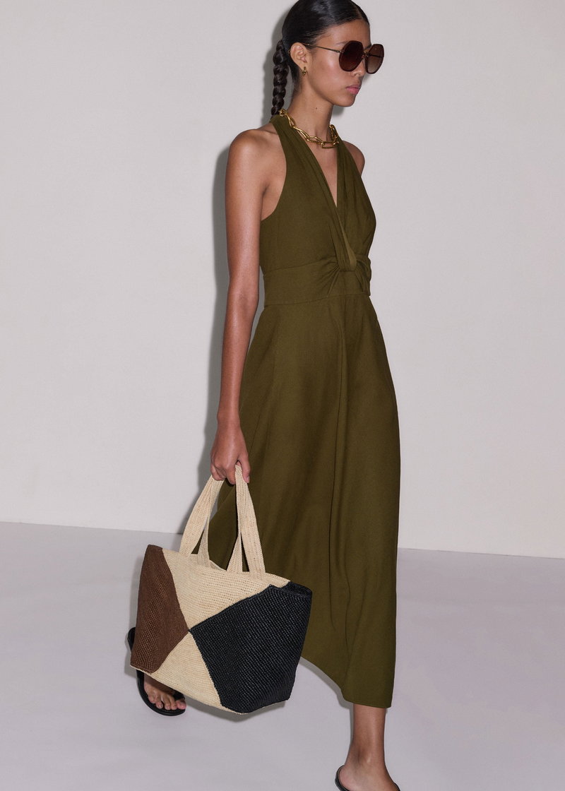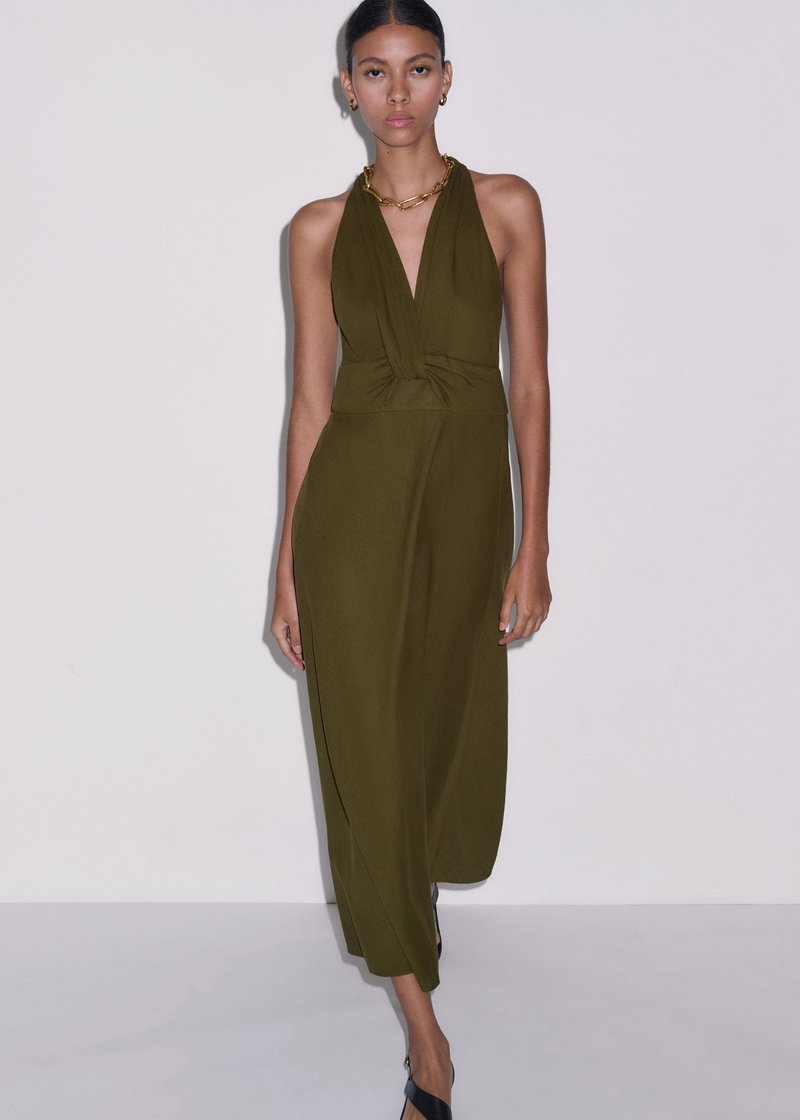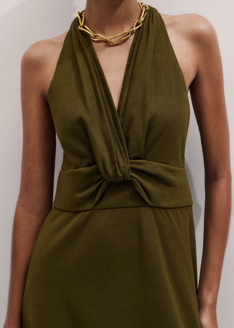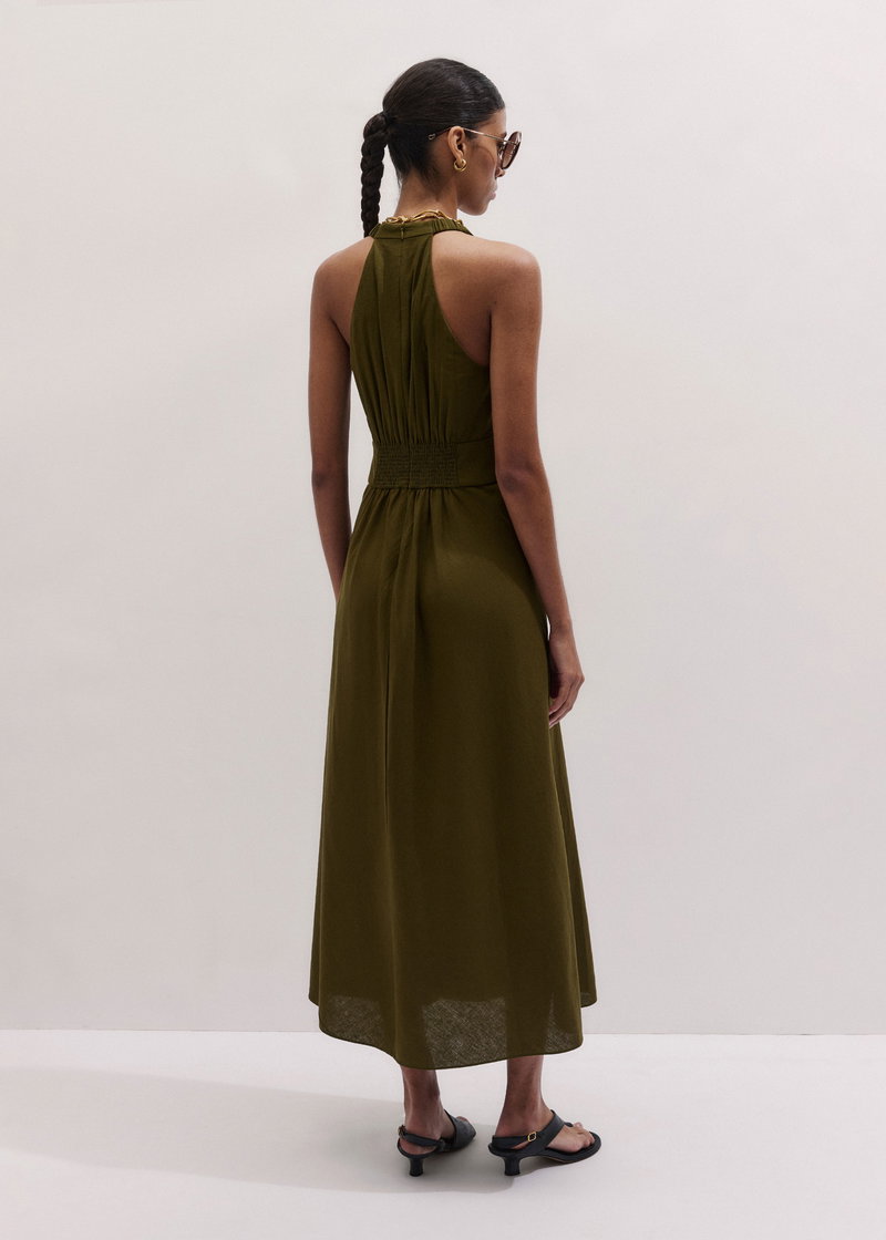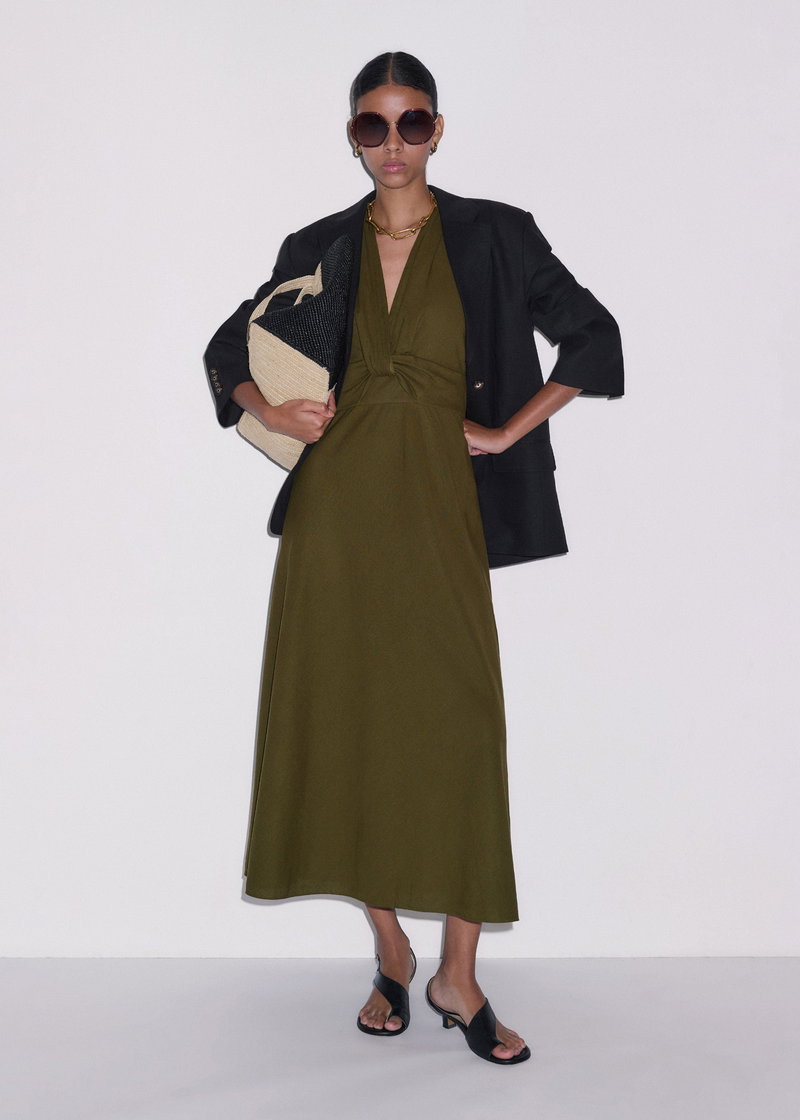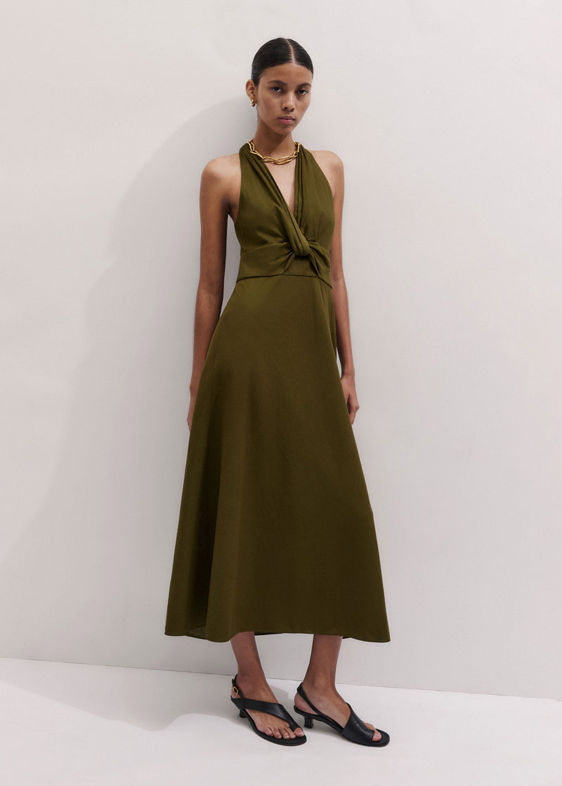 ME+EM's Olive Green Crease-Less Linen Twist Front Maxi Dress is crafted from linen blended with viscose to minimise creasing.